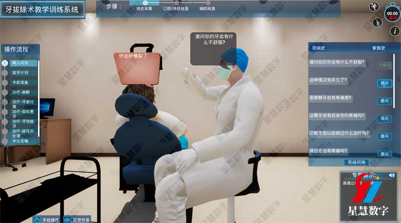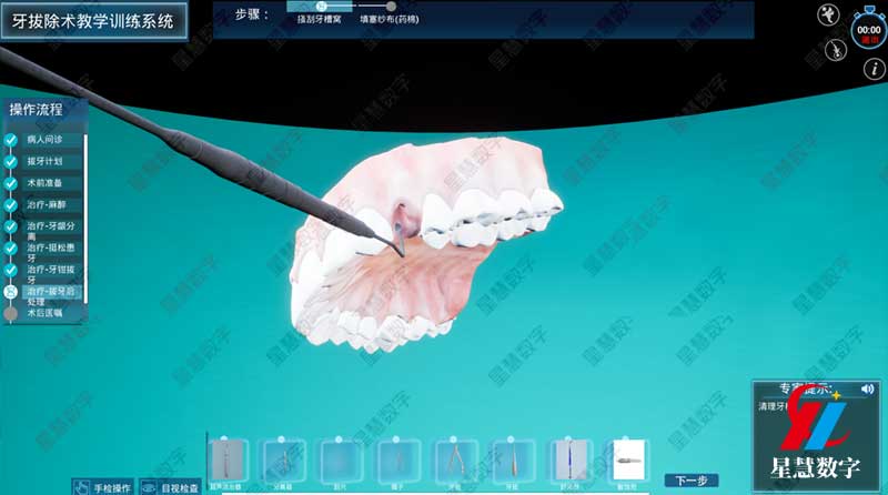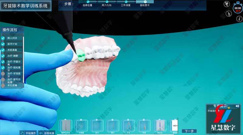 在训练路径上,系统遵循了循序渐进的教学规律。训练通常始于解剖认知和器械学习等基础知识模块。随后进入单项技能训练阶段,如局部麻醉进针点的寻找、牙龈分离、牙挺的杠杆原理应用等,每个步骤都有系统提示和实时纠错。最后可进行综合训练,学生需在虚拟诊室中完成从问诊、检查、制定方案到实施拔牙及术后处理的完整流程。这种全流程沉浸式操作,极大地强化了学生的临床思维和应变能力。
