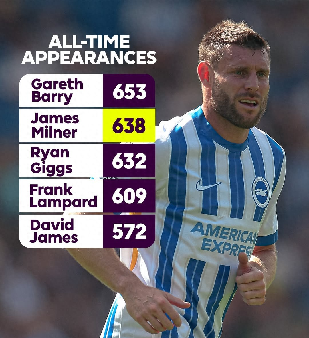 布莱顿中场詹姆斯·米尔纳(James Milner)在周三的英超联赛对阵阿斯顿维拉的比赛中,在比赛的第22分钟替补上场,以40岁之龄创下第653次在英超上场纪录,追平了前维拉及曼城中场巴里在英超赛事中的最多出场纪录。在这653场比赛中,米尔纳主力上场435场,替补上阵218场。