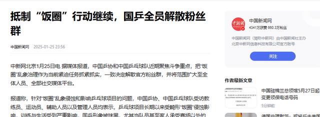 抵制“饭圈”行动继续,国乒全员解散粉丝群.中国新闻网.2025-01-25