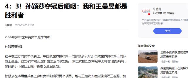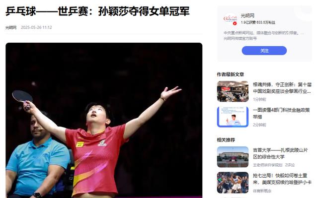 乒乓球——世乒赛:莎莎夺得女单冠军.光明网.2025-05-26
