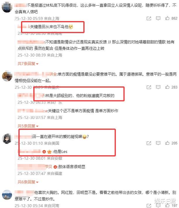 这次林俊杰官宣恋情,两家粉丝吵得不可开交,田馥甄粉丝说林俊杰私下玩得花,一直立深情人设,“田馥甄从来不鸟他。林是大师级别的,他的粉丝滤镜是天花板级别的。”“田一直避开林的爱的凝视。”