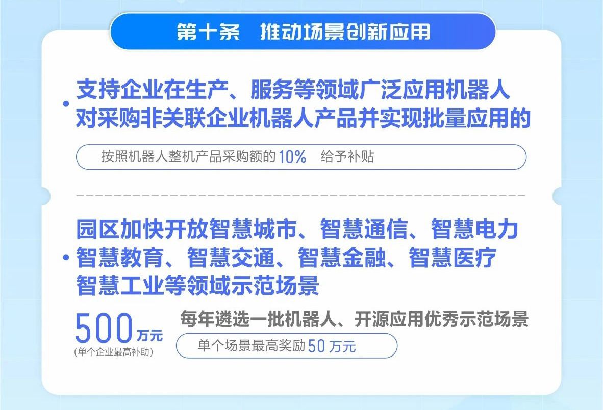 ⽀持企业在⽣产、服务等领域⼴泛应⽤机器⼈,对采购⾮关联企业机器⼈产品并实现批量应⽤的,按照机器⼈整机产品采购额的10%给予补贴;园区加快开放智慧城市、智慧通信、智慧电⼒、智慧教育、智慧交通、智慧⾦融、智慧医疗、智慧⼯业等领域⽰范场景,每年遴选⼀批机器⼈、开源应⽤优秀⽰范场景,单个场景最⾼给予50万元奖励。单个企业最⾼补助500万元。