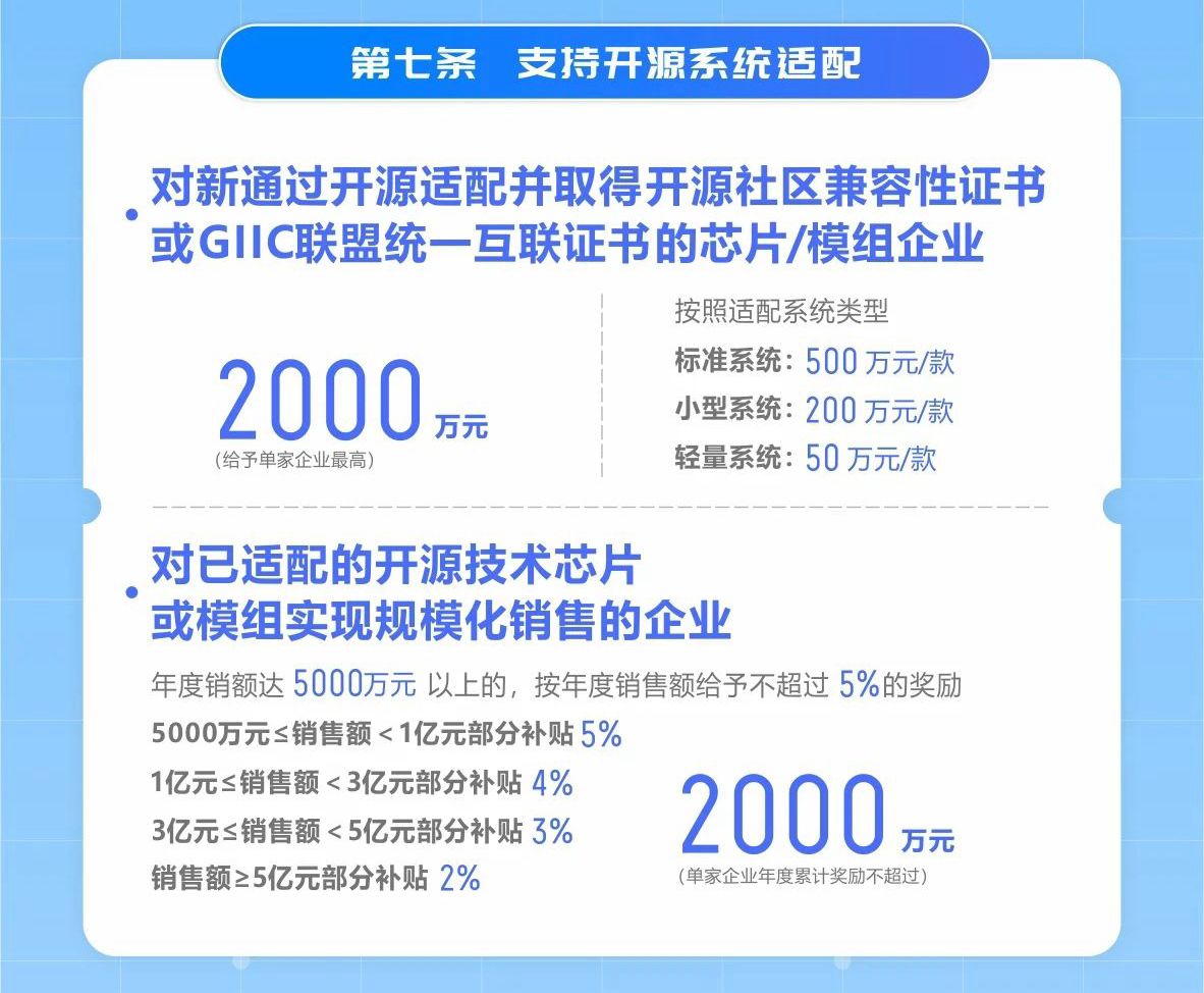 对新通过开源适配并取得开源社区兼容性证书或GIIC联盟统⼀互联证书的芯⽚/模组企业,按照适配系统类型(标准系统500万元/款,⼩型系统200万元/款,轻量系统50万元/款)给予单个企业最⾼2000万元/年的奖励。对已适配的开源技术芯⽚或模组实现规模化销售的企业,年度销售额达5000万元以上的,按年度销售额给予不超过5%的奖励(5000万元≤销售额<1亿元部分补贴5%,1亿元≤销售额<3亿元部分补贴4%,3亿元≤销售额<5亿元部分补贴3%,销售额≥5亿元部分补贴2%),单家企业年度累计奖励最⾼不超过2000万元。