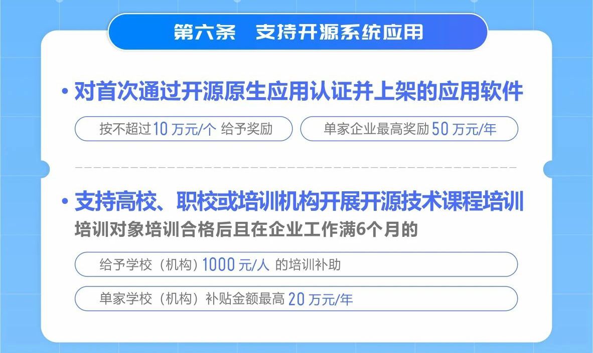 对⾸次通过开源原⽣应⽤认证并上架的应⽤软件,按不超过10万元/个给予奖励,单家企业最⾼奖励50万元/年。⽀持⾼校、职校和培训机构开展开源技术课程培训,培训对象培训合格后且在企业⼯作满6个⽉的,给予学校(机构)1000元/⼈的培训补贴,单家学校(机构)补贴⾦额最⾼20万元/年。