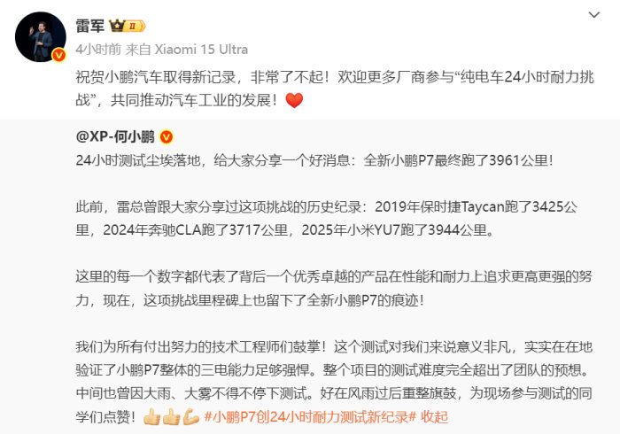这标志着,全新小鹏P7 24小时耐力测试总里程超过小米YU7,后者跑了3944公里。对此,雷军转发何小鹏微博,并写道,“祝贺小鹏汽车取得新纪录,非常了不起!欢迎更多厂商参与‘纯电车24小时耐力挑战’,共同推动汽车工业的发展!”而何小鹏附和道,“欢迎更多友商参与。”