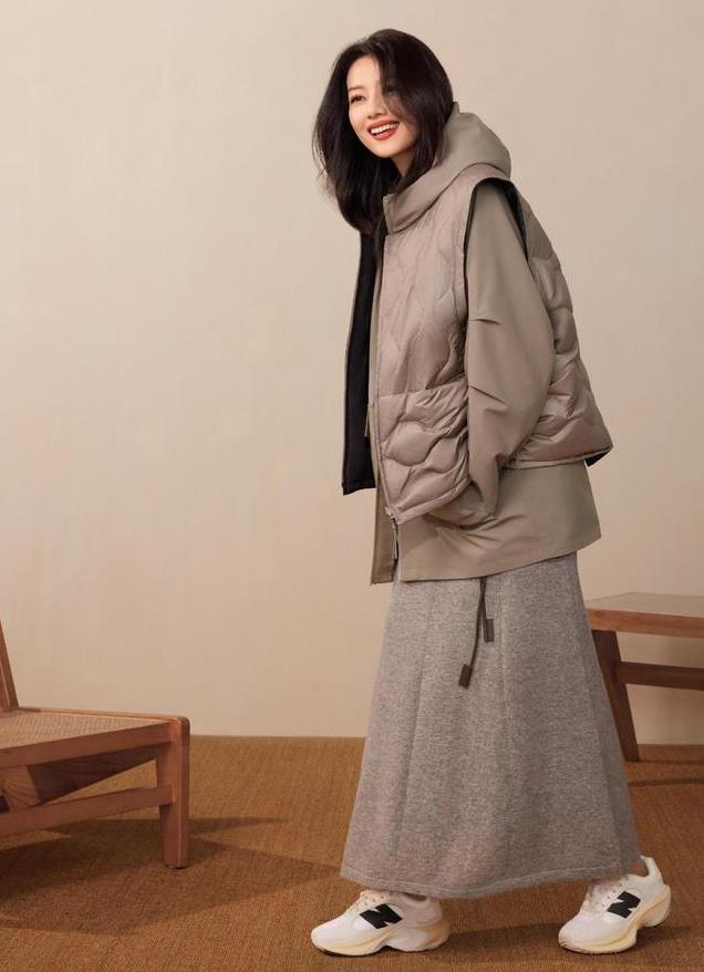 这件羽绒马甲款式宽松,叠穿在卫衣的外面可以加强造型的保暖性,敞开穿马甲,也会觉得没那么的紧绷,高圆圆还在下半身配上了一条宽松的半身长裙,更是能够体现松弛感。