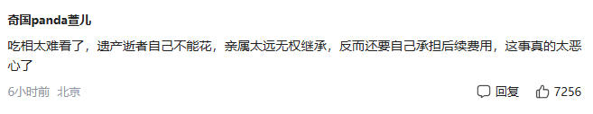 网友炸锅“吃相太难看了,遗产逝者自己不能花,亲属太远无权继承,反而还要自己承担后续费用,这事真的太恶心了。”这条评论获七千多赞,道出许多人的不满。