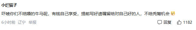 更尖锐的评论直言:“吓唬你们不结婚的牛马呢,有钱自己享受,提前写好遗嘱留给对自己好的人。”