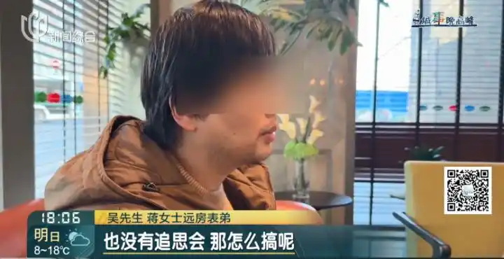 “爷爷的姐姐的儿子”——这是吴先生与蒋女士的全部亲属关系。 在蒋女士父母早逝、姑姑今年4月离世、舅舅早年去世的情况下,这位远方表弟成了她最亲近的人。