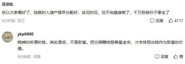 “所以大家看好了,独居的人遗产提早分配好,该花的花,花不完直接烧了,千万别被孙子拿走了。”浙江网友的“实用建议”获四千多赞。