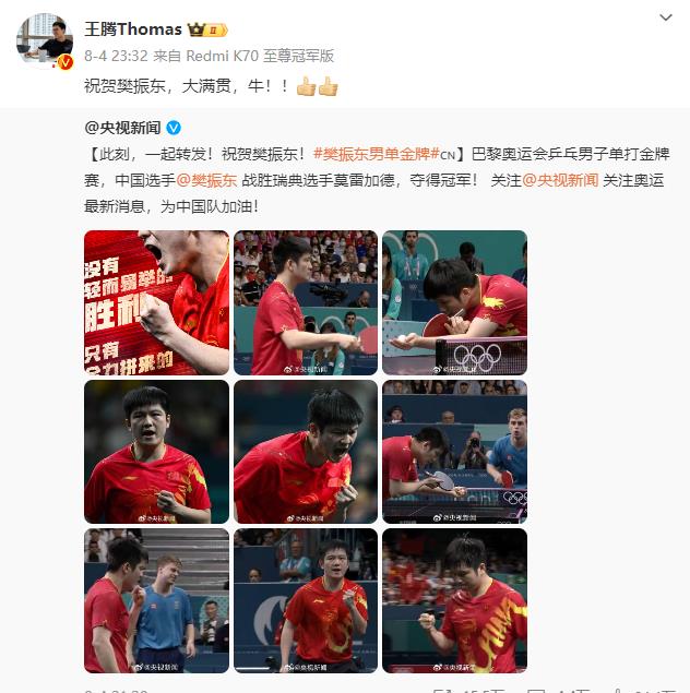 而且当初樊振东拿巴黎奥运会乒乓球冠军时,担任品牌商总经理的王腾还专门发文,恭喜他夺冠,当时很多粉丝喊话王腾,让他签下樊振东,作为品牌代言人。