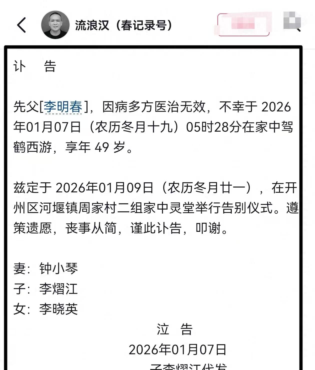 半夜工地传来汽笛,几盏昏黄路灯下,重庆包工头李明春结束了最后一轮酒局,照例举起手机,录下那句“不醉不休”。直到2024年12月底,他的短视频账号还在更新,记录着和工友们的生活琐事,笑声和酒杯交错。没人料到2025年刚过元旦,家属发出讣告,李明春因病离世,年仅49岁。