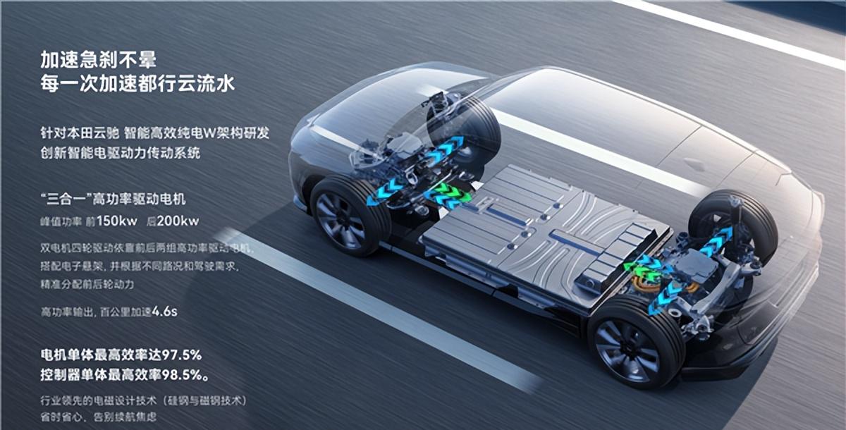 接下来,我们再来看看P7的核心——三电系统。本田为P7配备了全新开发的三合一高功率电机,双电机四驱版本百公里加速最快可达4.6秒,性能表现相当出色。电池方面,P7采用了宁德时代提供的90kWh高能量密度三元锂电池,CLTC工况续航最高可达650km。此外,P7还配备了热泵空调智能热管理系统,即使在极寒环境下也能保证电池的稳定性。从数据上看,P7的三电系统已经达到了行业领先水平。