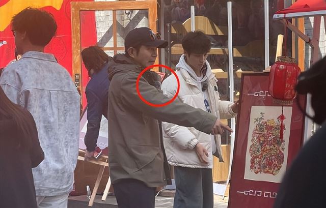 有人拍到他在套圈摊位旁翘着二郎腿,跟卖气球的大爷学吆喝。