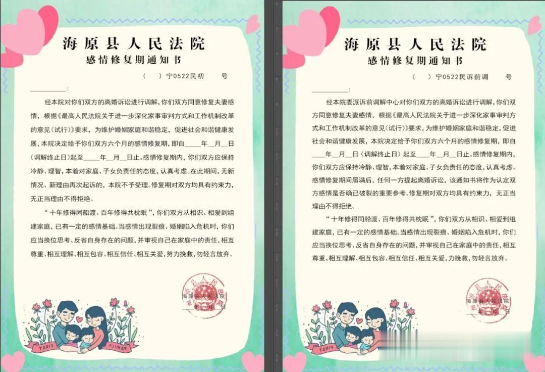 2022年,宁夏海原县人民法院办案法官发出了一份《情感修复期通知书》,给予双方6个月的感情修复期,告知双方冷静思考,相互理解包容,珍惜情感,挽救婚姻。