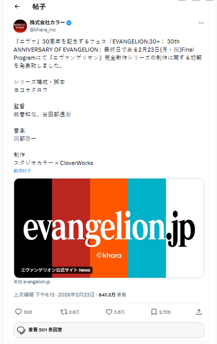 2026 年 2 月 23 日,《新世纪福音战士》30 周年纪念活动「EVANGELION:30+; 30th ANNIVERSARY OF EVANGELION」收官之日,官方正式宣布启动 **《新世纪福音战士》完全新作系列 **,继 2021 年《新剧场版:终》完结旧系列后,开启全新影视篇章。