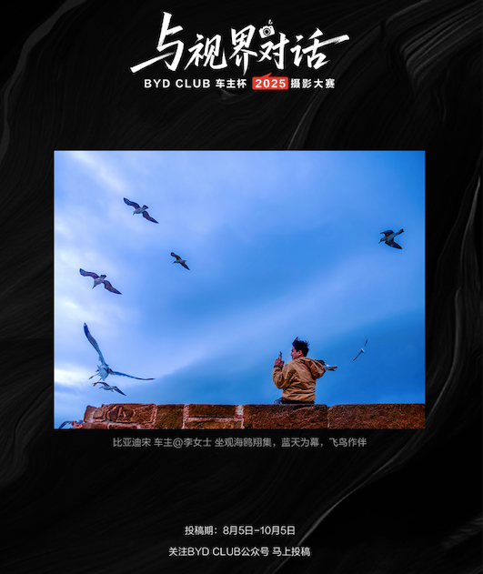 日前,在BYD CLUB车主杯·2025摄影大赛的投稿里,我们看到了许多人气佳作。如果你想你的“视界”被更多人看见,世界将与你一起书写生活的“未完待续”。BYD CLUB车主杯·2025摄影大赛人气奖进行中,快来投稿、分享、集赞,有意想不到的惊喜等着你。下面分享几张我个人比较喜欢的作品,也期待早日看到你的作品。