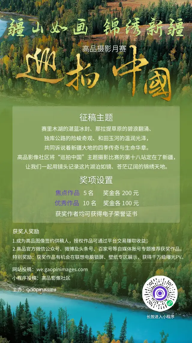 高品影像社区将“巡拍中国”主题摄影比赛的第十八站定在了新疆,让我们一起用镜头记录这片湖泊如镜、苍茫辽阔的锦绣天地。