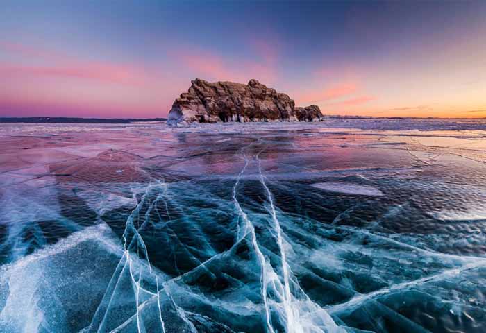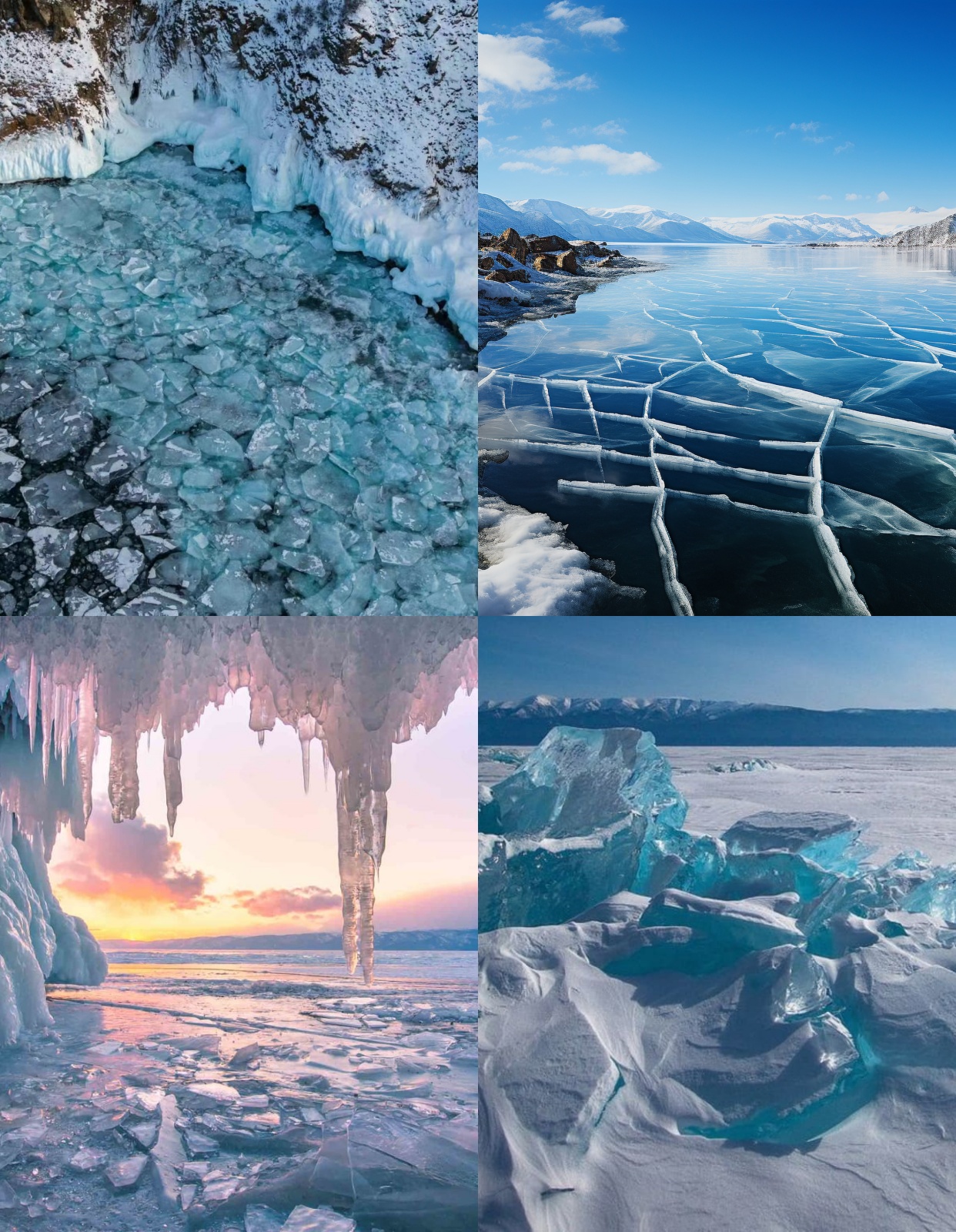 🫧贝加尔湖心脏奥利洪岛▫上岛需要坐气垫船或者俄式越野车瓦茨车▫走北线看的是蓝冰、冰裂纹,沿途欣赏鳄鱼岛、人脸山、三兄弟石等▫走南线看的是气泡冰、冰洞、冰柱,沿途会经过哈拉噶伊角、沙腊玛峡谷▫萨满岩看日落,夕阳把冰面染成玫瑰金