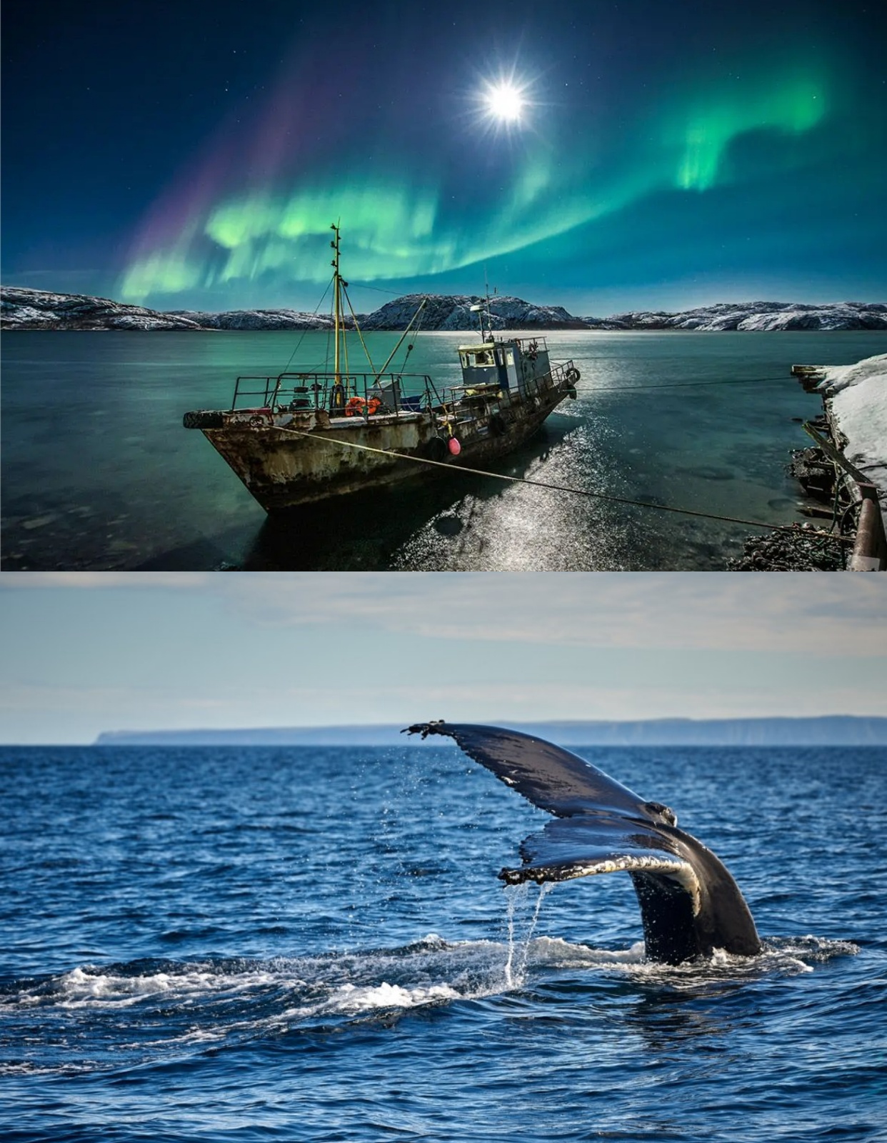🐋追鲸&极光捷里别尔卡▫除了摩尔曼斯克,这里是境内最佳极光观赏地之一▫摩尔曼斯克出发2小时车程就能抵达▫白天乘船在北冰洋追寻鲸群踪迹,夜晚在沉船湾等待极光降临