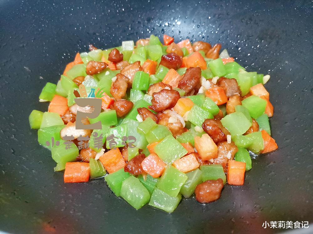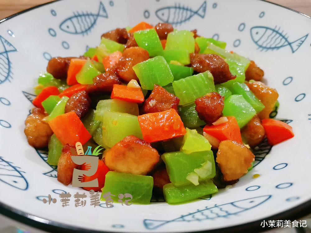 1、仔细将其外皮削掉,不再有筋络为止,切成小块。再处理一根胡萝卜,切成同样的形状。