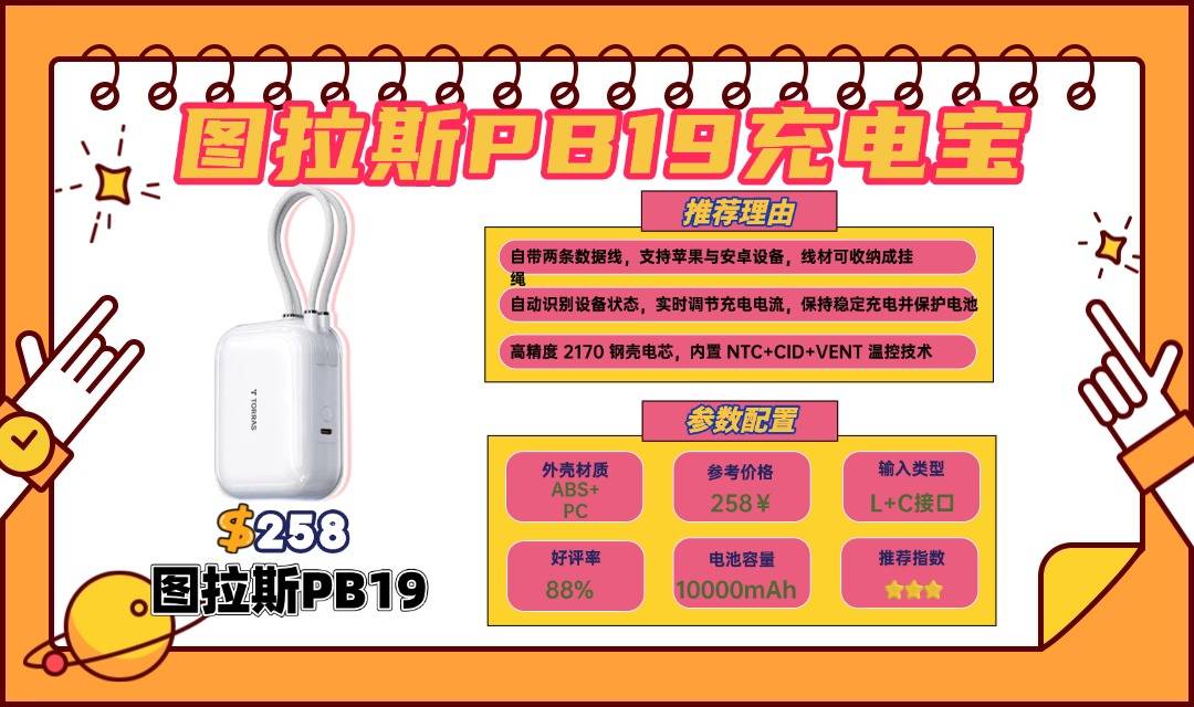 图拉斯 PB19 容量10000mAh,额定6500mAh,配备两条自带充电线,一条兼容苹果和安卓设备,可收纳当手提绳使用,便于携带。充电线采用尼龙编织,耐磨性好,日常使用不易损坏。