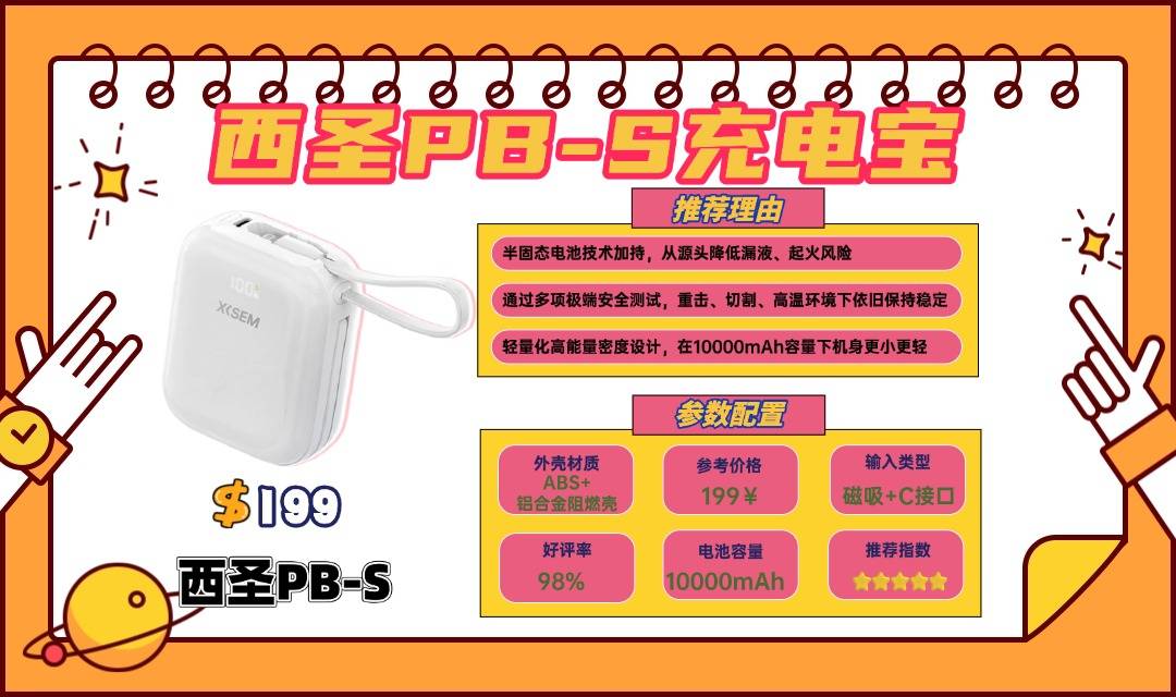 更便捷的是它还内置Lightning + Type-C 双自带线,从接口布局到出线角度都经过反复优化,无需额外携带数据线,无论通勤、旅行还是户外使用,都能带来极致便捷的使用体验,在同价位充电宝中极具辨识度,广受用户好评。西圣PB‑S充电宝表现同样出色。10000mAh大容量电芯搭配22.5W PD快充,充电效率高效稳定,无论手机、平板还是其他设备,都能迅速回血;整机通过国家3C认证,符合航空携带标准,可安心登机出行,真正做到高性能、安全可靠的移动电源典范。