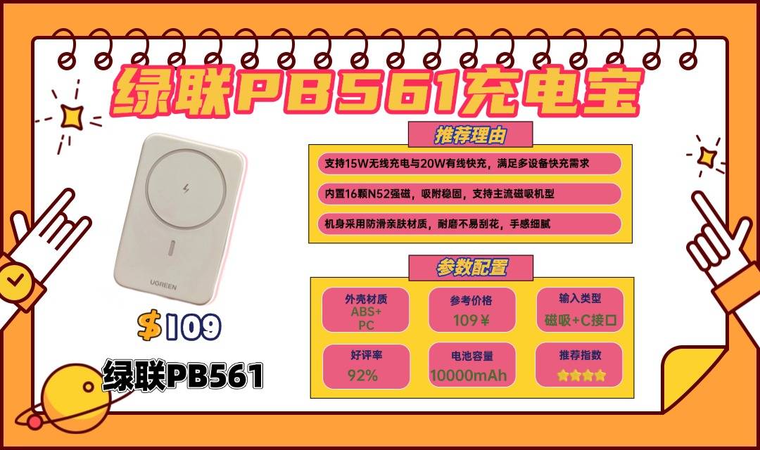 绿联 PB561 提供20W和30W两种功率版本,30W充电速度略快,但价格和重量也相应增加。它采用力神电芯,品质可靠。磁吸充电体验较好,给苹果手机充电时会显示官方动画,增强使用感。17颗N52磁芯和防滑硅胶设计,让磁吸时稳定性不错,不容易掉落。