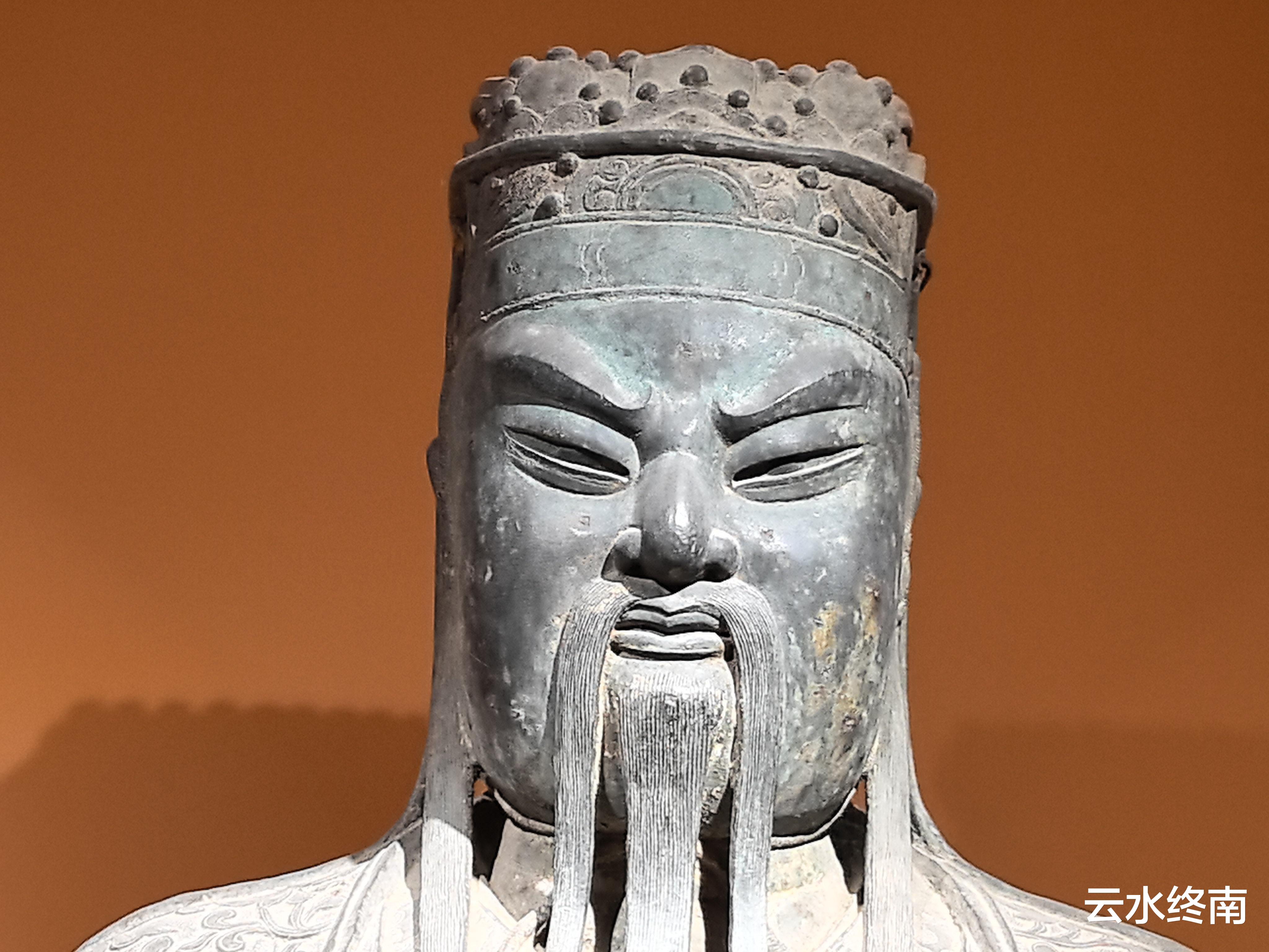 头戴帝冠,冠上饰有泡钉云纹,还有一条宽带从冠前绕到肩肘。大耳垂肩,五绺长髯下垂至胸前,冠带系于颌下。