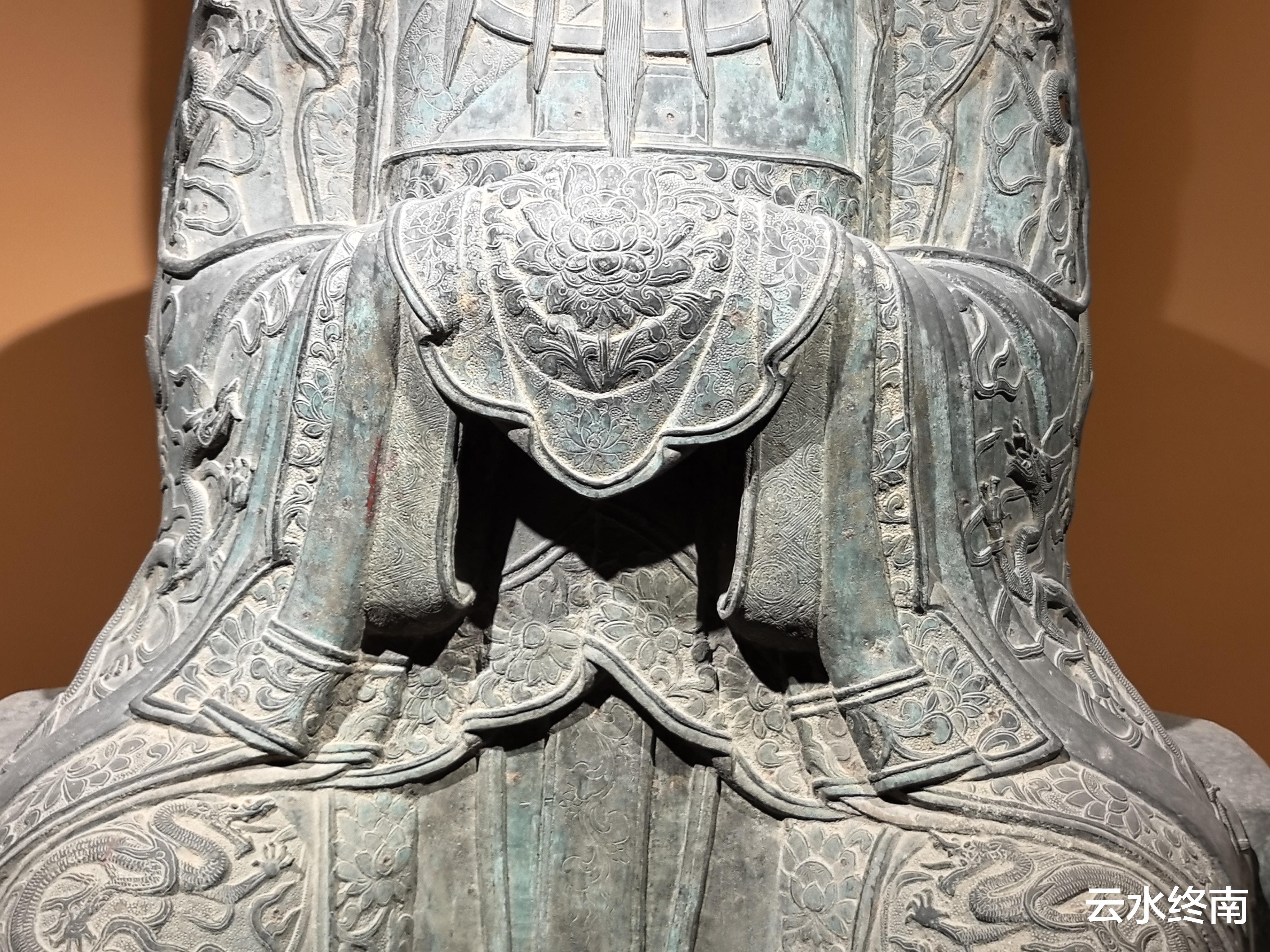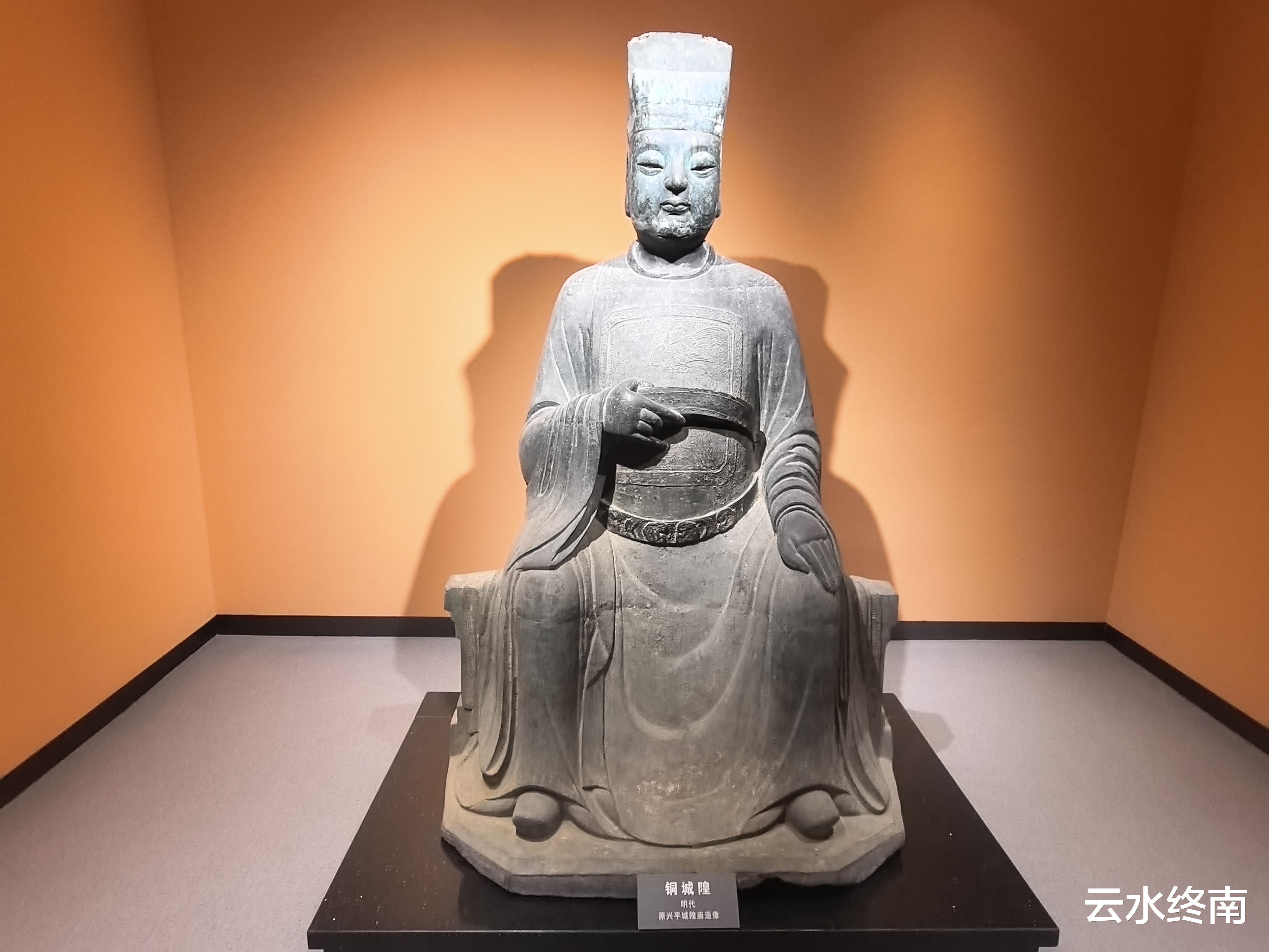 明代的城隍铜造像通高190厘米,身着明代圆领官服,右手执玉带,左手平放膝上,一副和善的面孔。