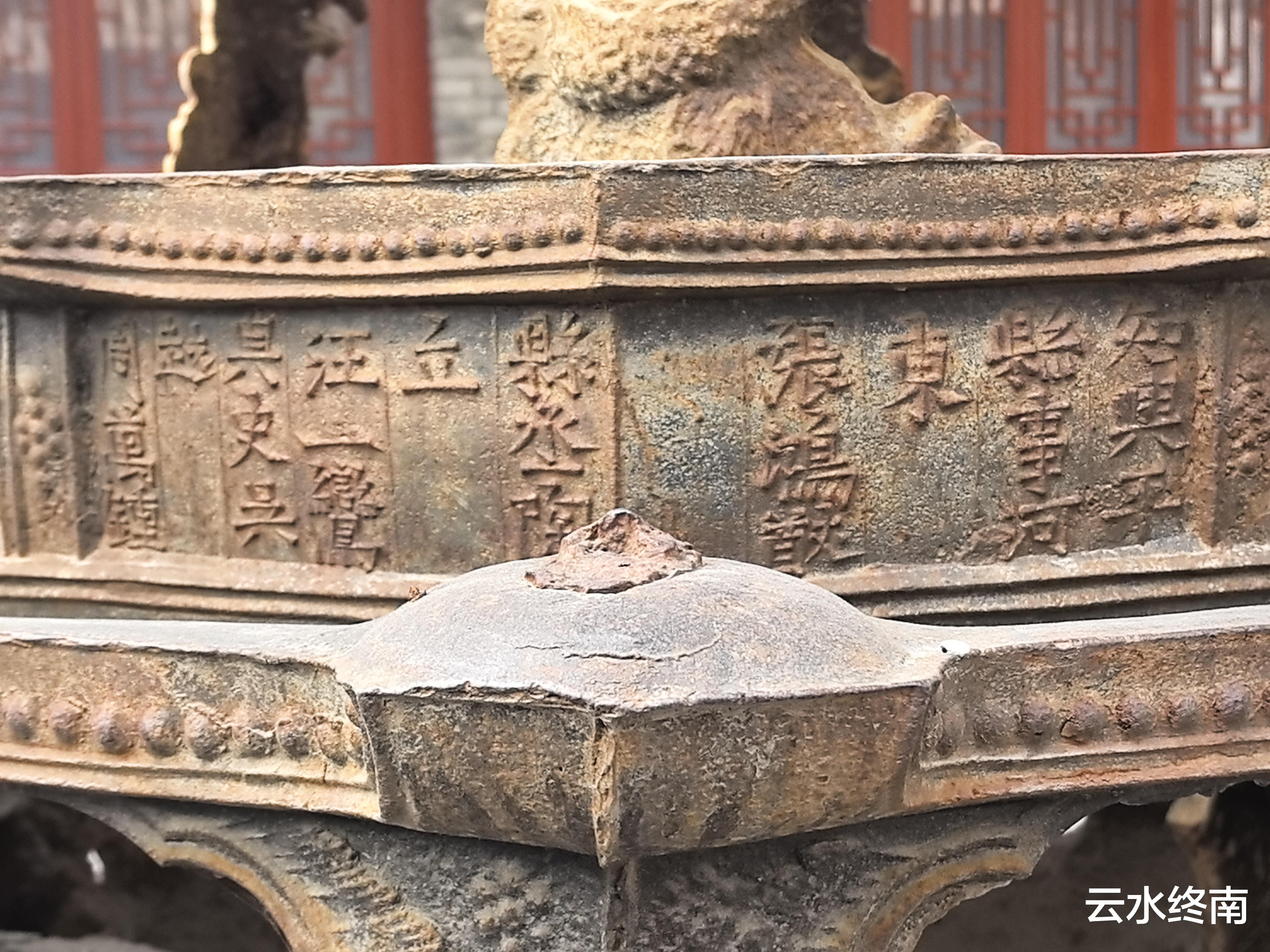 铁醮炉也叫焚裱炉,炉身刻有人名、力士、盘龙、菩萨等图案,造型精美,炉身铸有“大明国陕西西安府兴平县‘’等字样,有铸造人出资人信息,共148字。