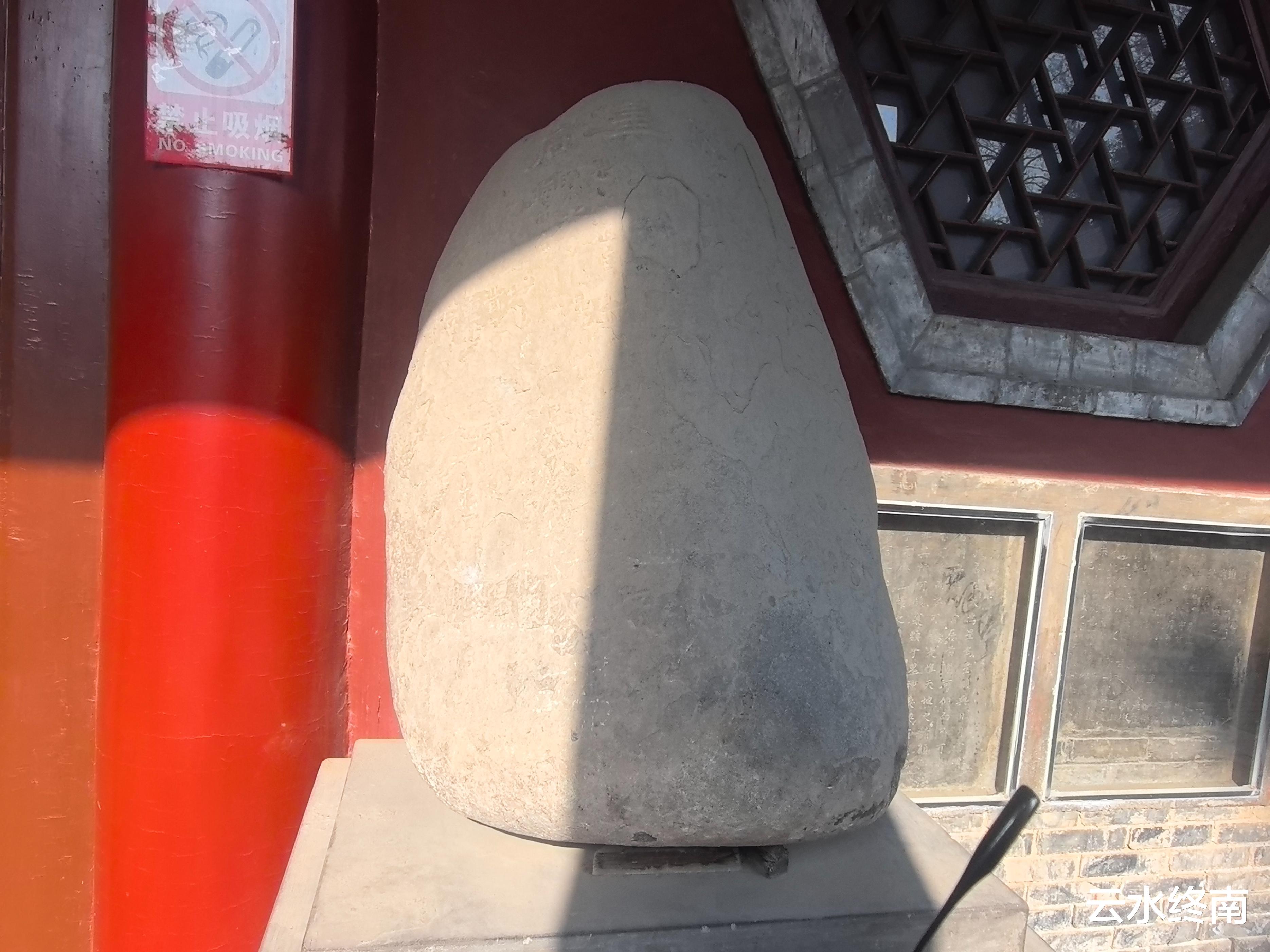大殿前的“落星石”,上面的文字已经剥落不认。这石头说是晋朝降于槐里县的天外来物,当时的县令移送到县衙并作跋文以纪念。