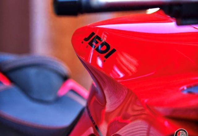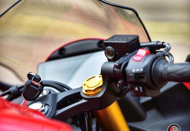 油箱的设计也很独特,外骨骼式的设计,两侧凸起,这对于骑行时腿部的固定是非常有帮助的。就像给骑士的双腿找到了一个舒适的依靠,让骑行变得更加自在。排气系统与车身的整合也十分巧妙,整车线条因此变得更加简洁流畅。车身侧面的覆盖件通过立体折线营造出双翼梁车架的视觉效果,这种视觉上的错觉让车子看起来更加高大上,同时也强调了它的运动感。