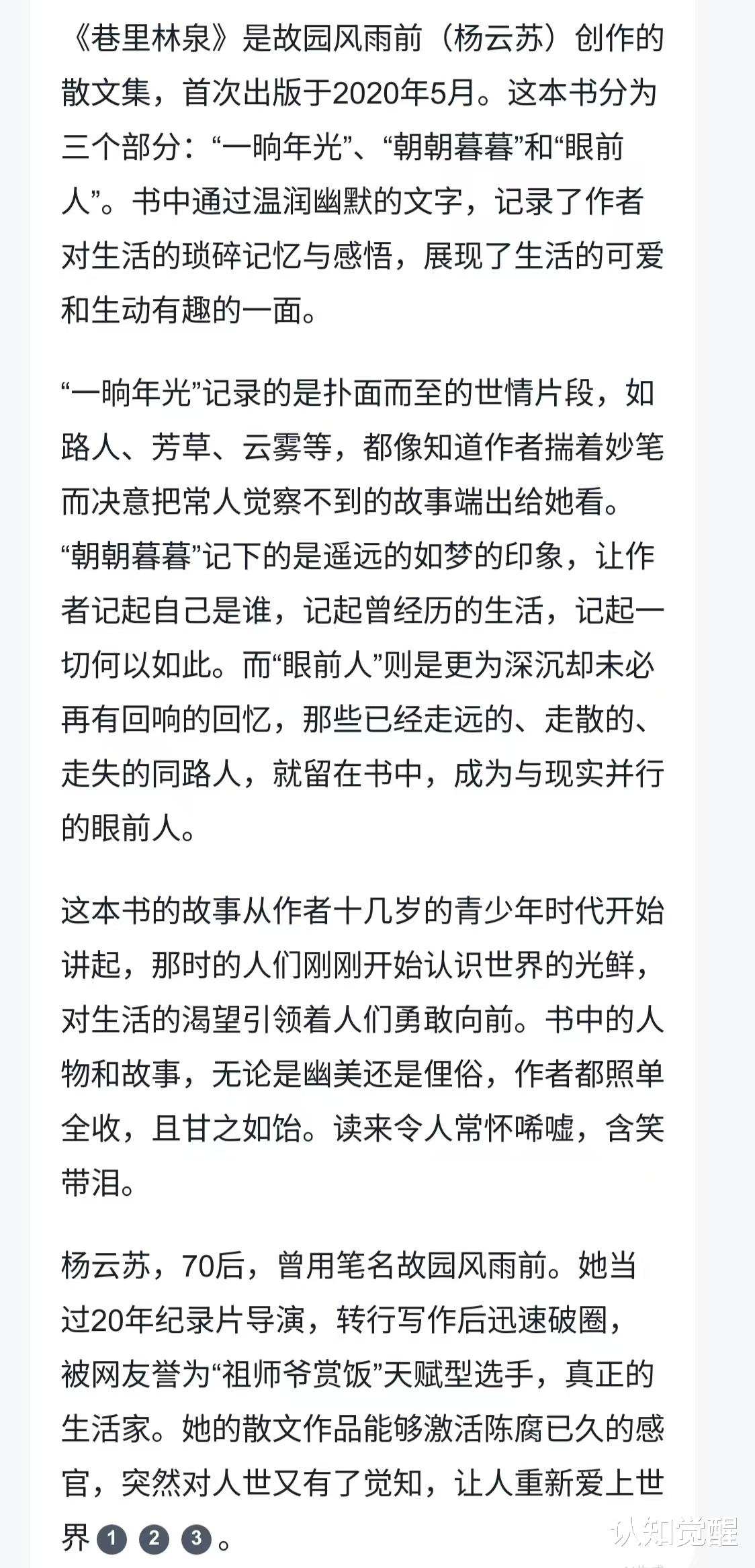 如果您渴望在书里找到平静和治愈,如果您希望提升自己的文笔,如果您在众多的书籍面前不知道该怎么选择,那么,请打开《巷里林泉》,它一定会给您带来意想不到的收获。