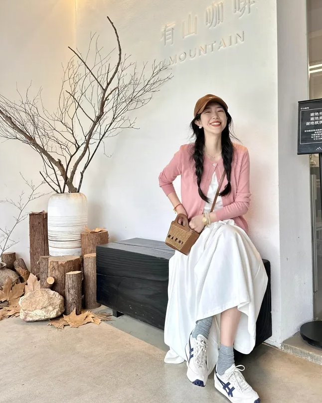 穿衣打扮一定要格外注重配色,就好比在搭配小白裙的时候,上衣可以尝试一下彩色系,比如粉色针织衫和白色伞裙堪称绝配,配鬼虎冢运动鞋,时尚感拉满。