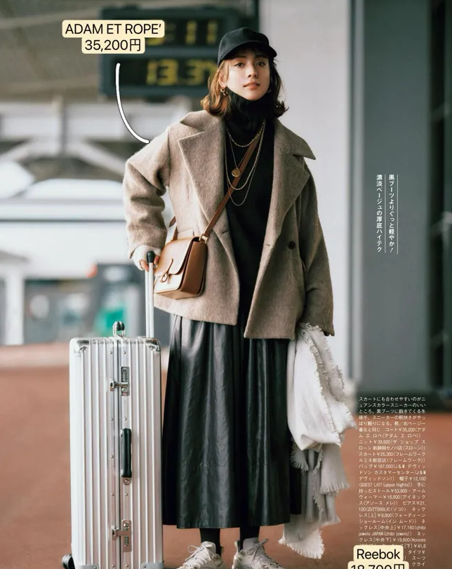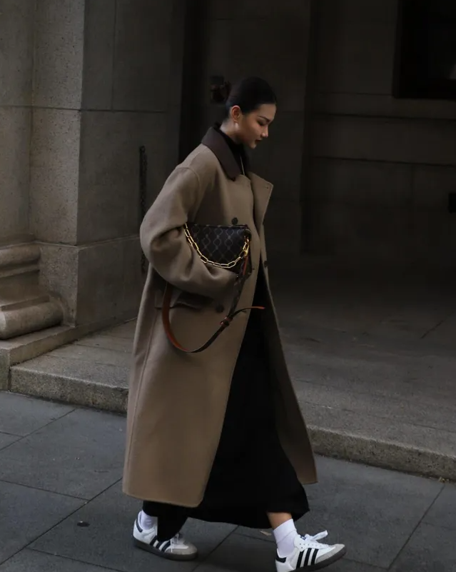 冬季特别适合穿长款服饰,无论是裙子还是外套,都可以优先选择长款。长裙和长款外套的组合,要遵循“内长外短”的法则,内搭的裙摆露出一截,可以让造型更有层次感,配平底款式的运动鞋也不压个子。