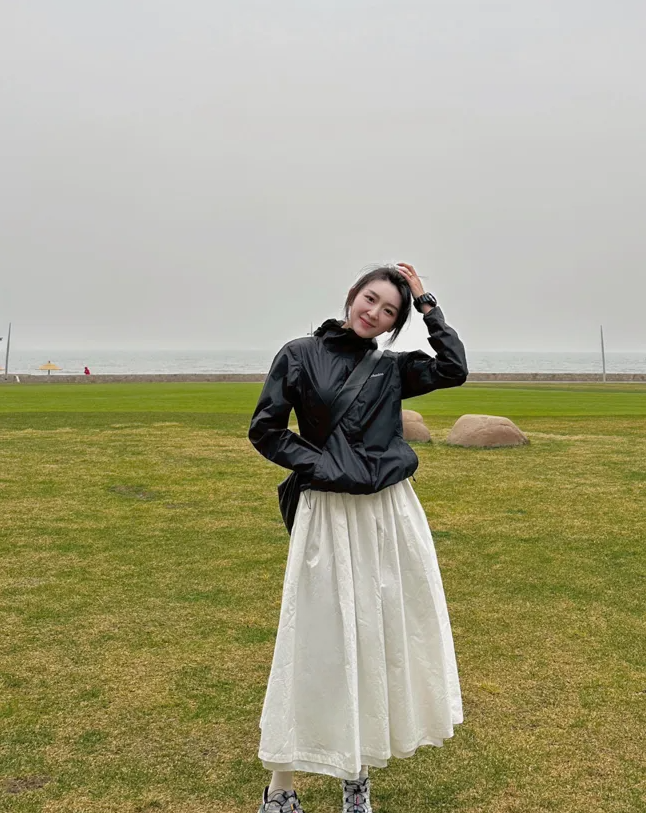 伞裙可是优雅的代名词,宽阔的裙摆对身材有着无限的包容性,轻轻松松就能藏住下身短板,搭配运动鞋的时候,就算是穿双裤袜也没有臃肿的问题。