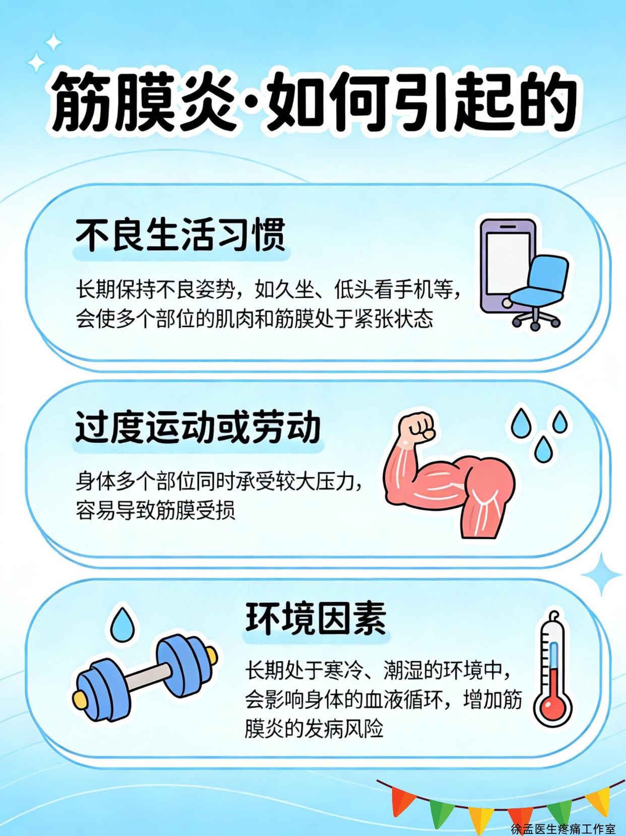 🌬环境因素:长期处于寒冷、潮湿的环境中,会影响身体的血液循环,增加筋膜炎的发病风险。