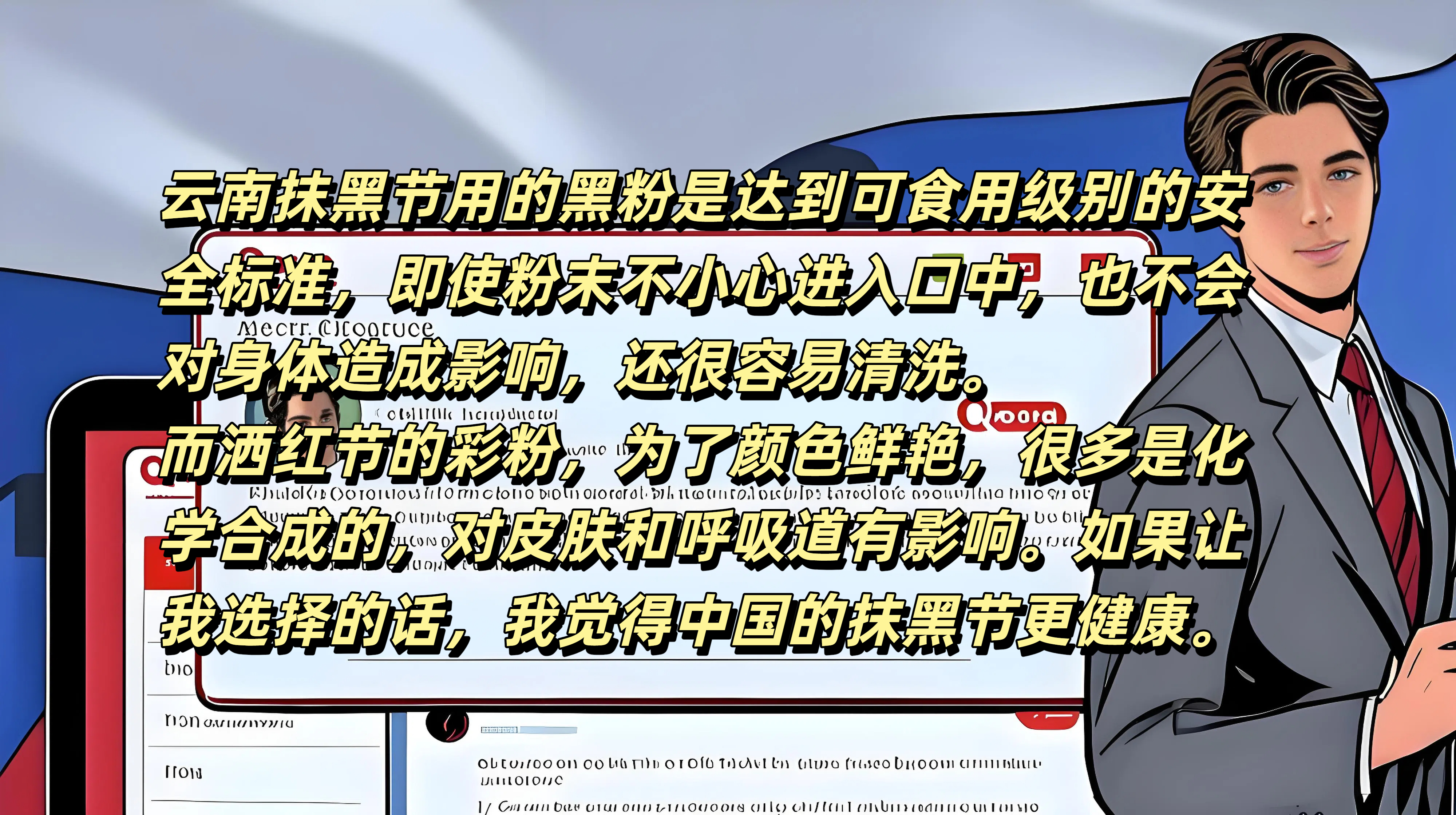 最后一位俄罗斯网友也站出来说话:“云南抹黑节用的黑粉是达到可食用级别的安全标准,即使粉末不小心进入口中,也不会对身体造成影响,还很容易清洗。