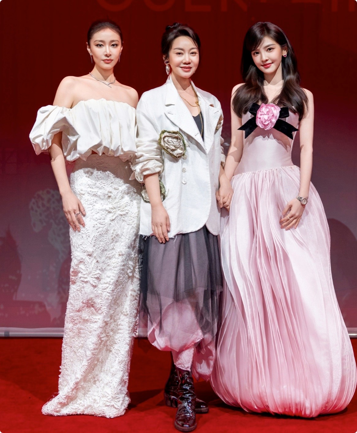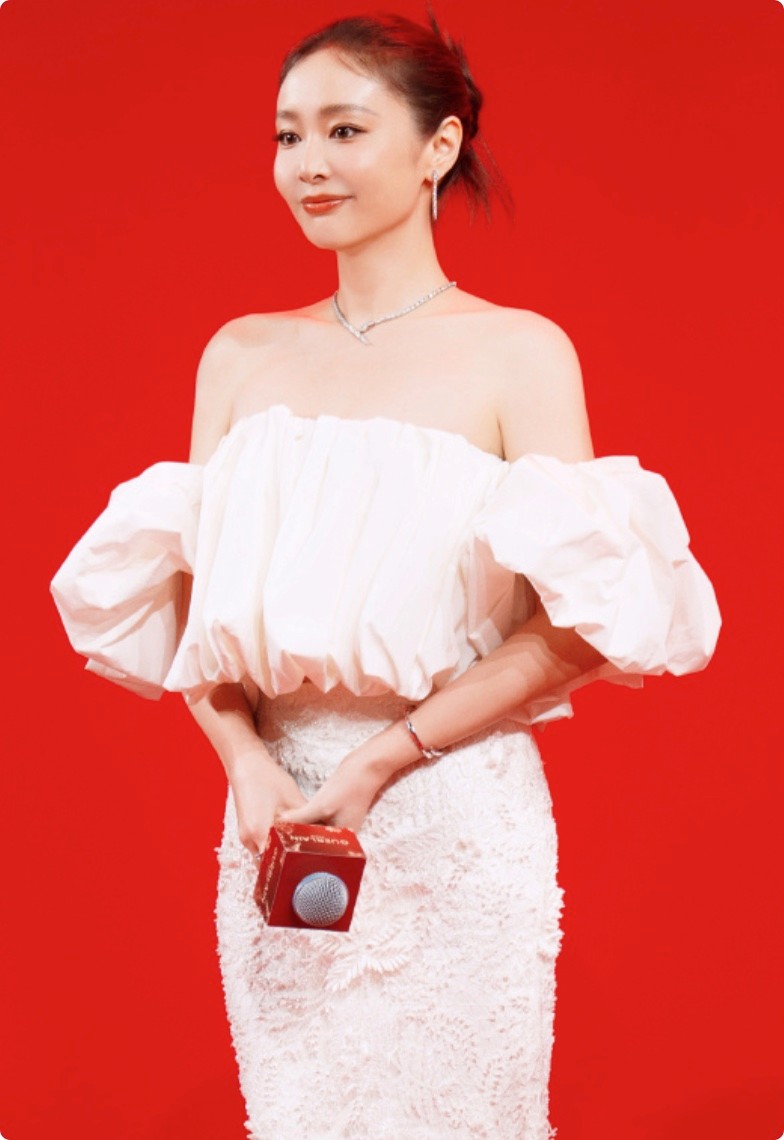 当天她穿了件白色西装外套,内搭一条黑色网纱裙,本想走优雅知性路线,可西装的版型太过宽松,网纱裙的材质也显得廉价,整体看着像从衣柜深处翻出来的压箱底货,完全没有高端活动该有的精致感。