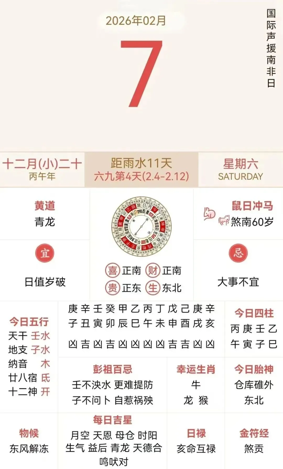 小运播报:2026年2月7日,星期六,农历十二月二十(丙午年庚寅月壬子日),法定节假日