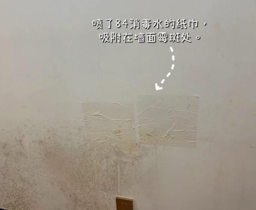 其实常见的84消毒液就能发挥奇效。将其按照一比一的比例稀释,装入喷壶后喷洒在霉斑处,再用纸巾覆盖。