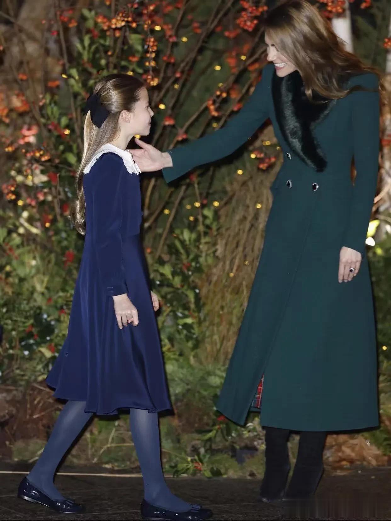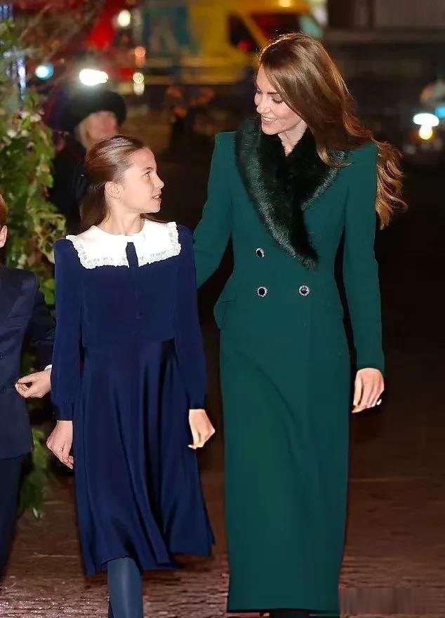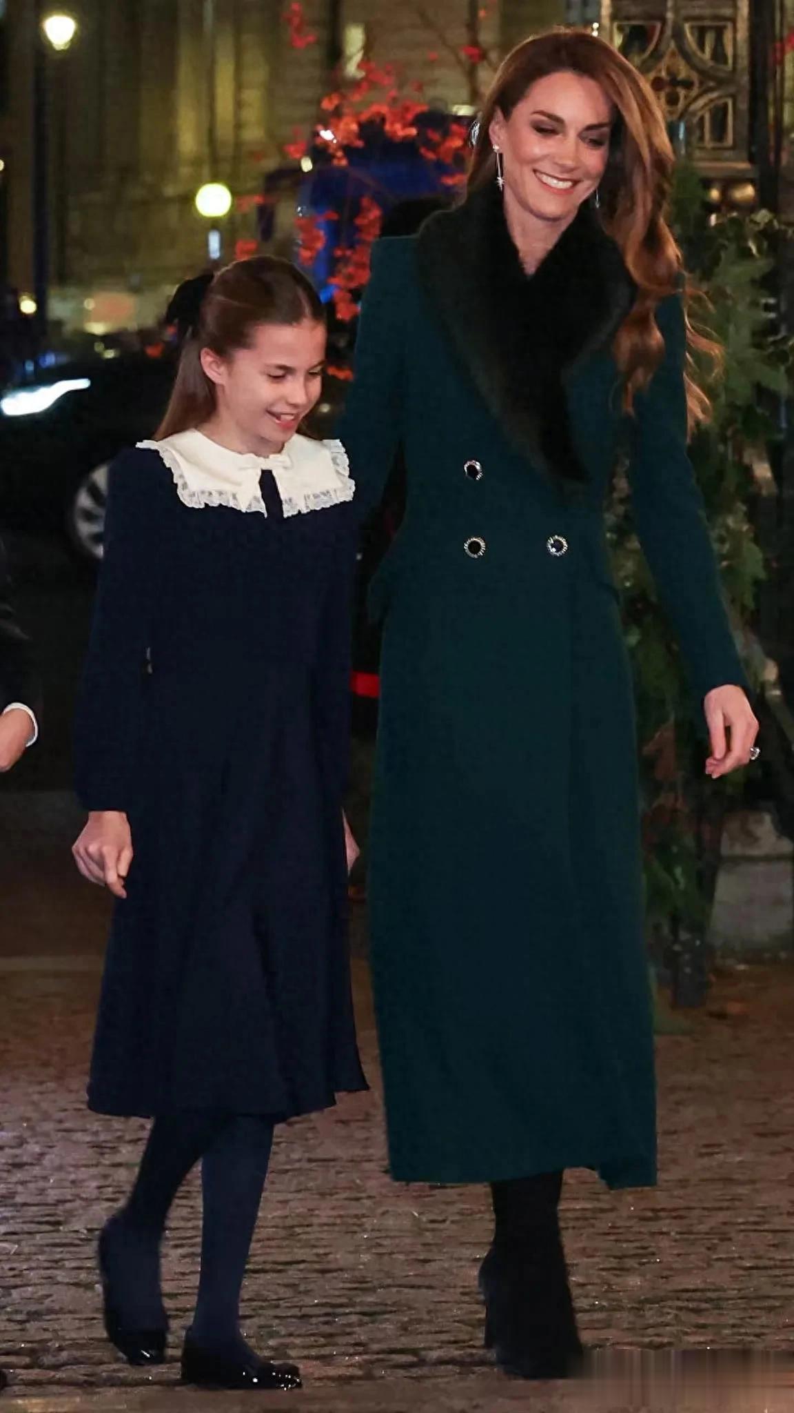 当晚凯特和女儿夏洛特的穿搭也是那样的端庄高雅,女儿选择了深蓝色的翻领连衣裙,妈妈则是绿色的长款大衣,两母女都是低调优雅的装扮,但又都是那样难掩耀眼与明媚。