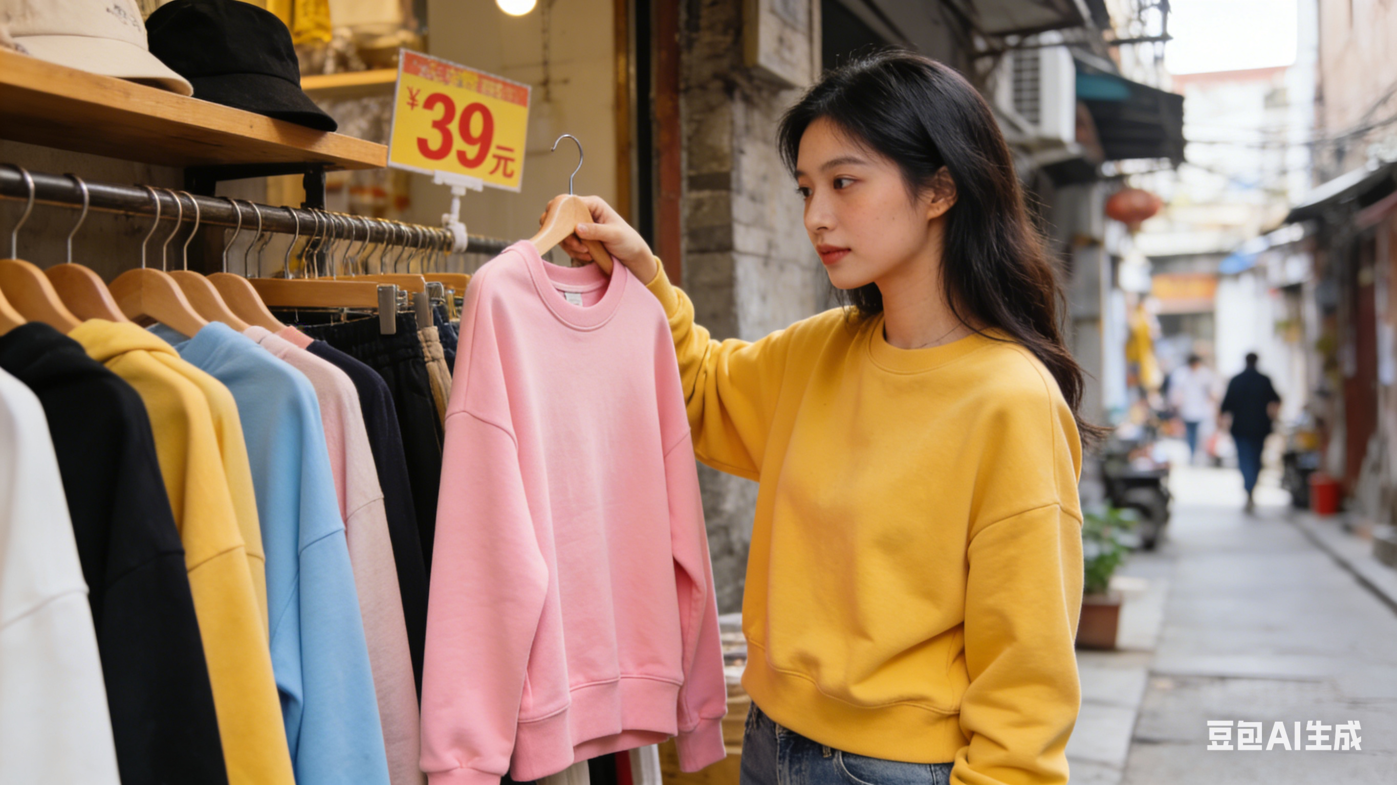 上周跟姐妹逛城中村的外贸小店,她拿起一件 39 块的磨毛卫衣,刚要扫码又缩手:“下周要去参加同学生日会,穿这么便宜,会不会被说抠门啊?”