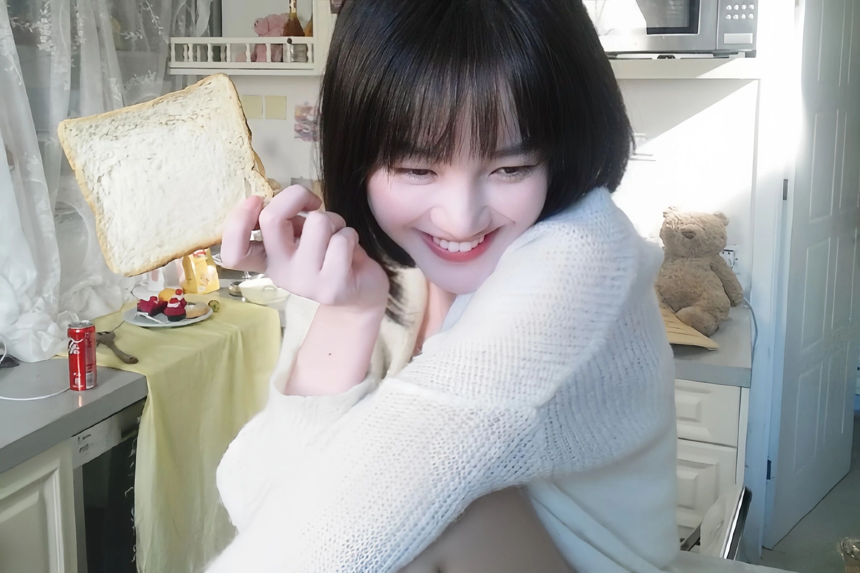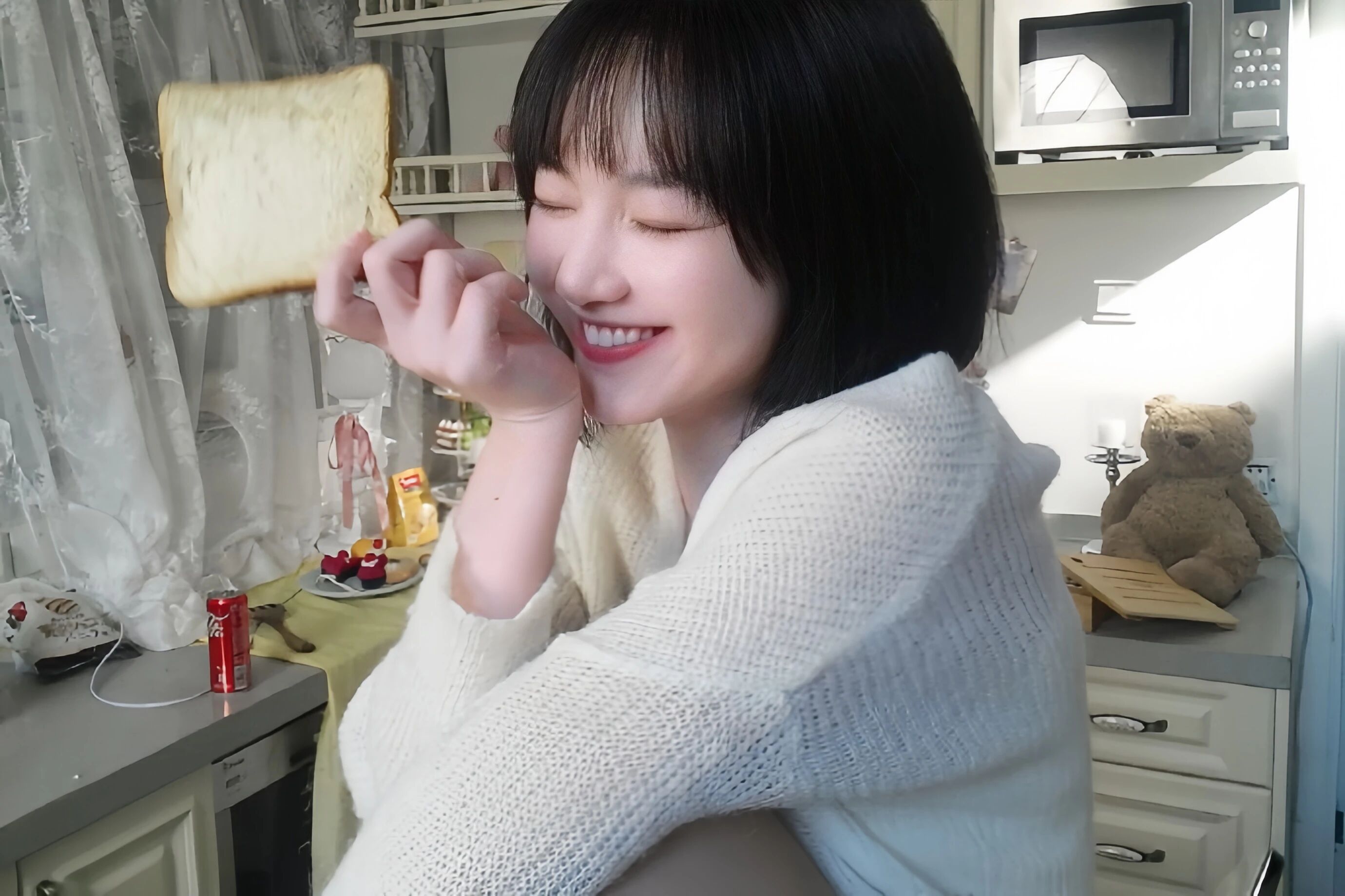 第二张图里吐司 “飞” 在半空,她蜷着胳膊捂嘴笑,眼睛眯成两条缝,像偷吃了糖的小狐狸。阳光把她的影子投在墙上,毛茸茸的头发顶在脑袋上,我突然想冲进屏幕里,把那片吐司抢过来,再捏捏她的脸。她笑起来会皱鼻子,露出两颗小虎牙,我盯着那个笑容看了五分钟,连工作群的消息都没回。