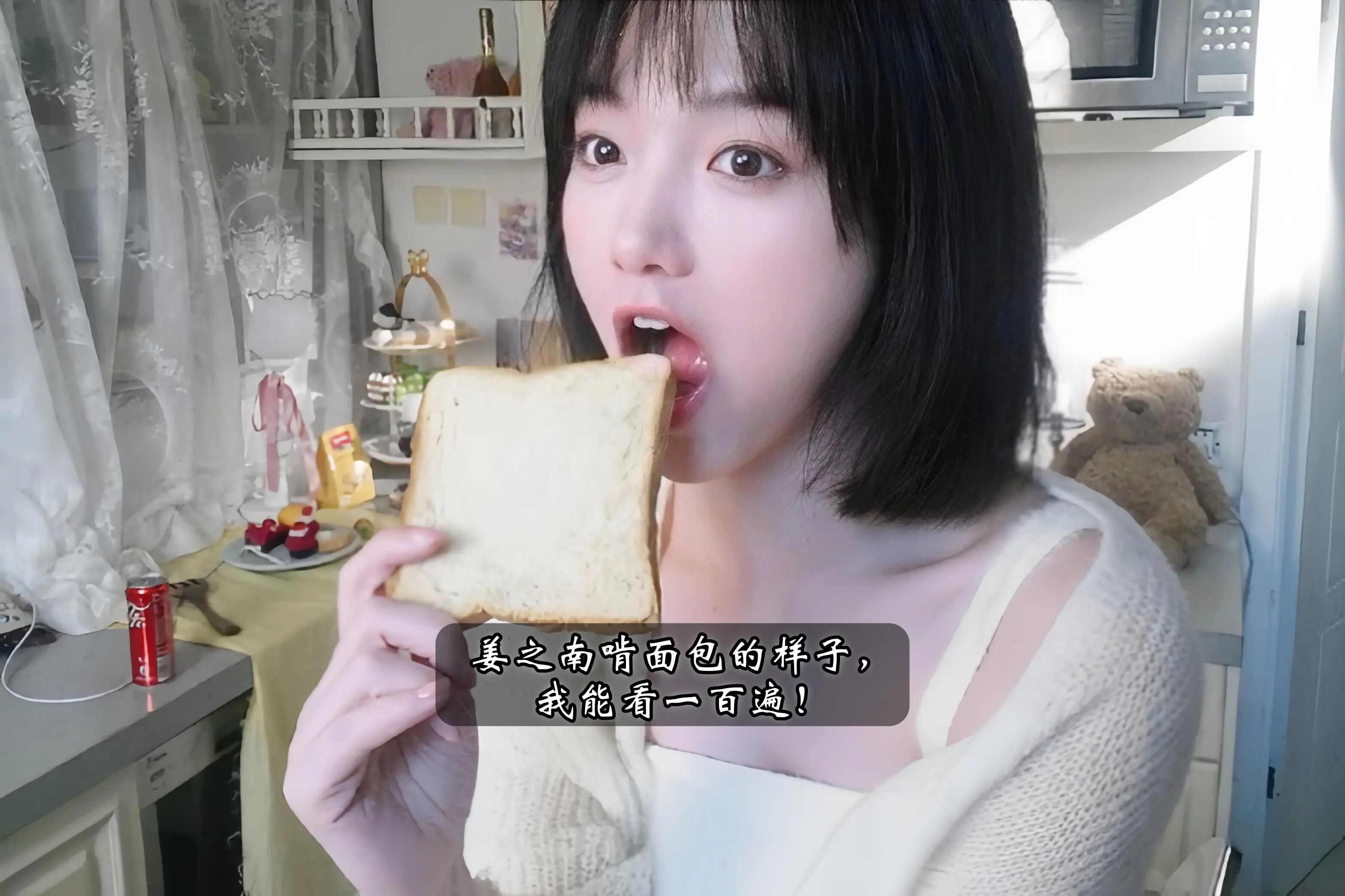 今天早上吃吐司的时候,我突然学着她的样子咬了一口,镜子里的自己笑得像个傻子。原来好看的人连吃饭都能让人上瘾,不是馋她的脸,是馋那种 “被阳光晒过的温柔”。下次再刷到她的动态,我要评论:“姐姐,我想当你手里的那片面包。” 毕竟能被她咬在嘴里,大概是全世界最幸福的吐司了。