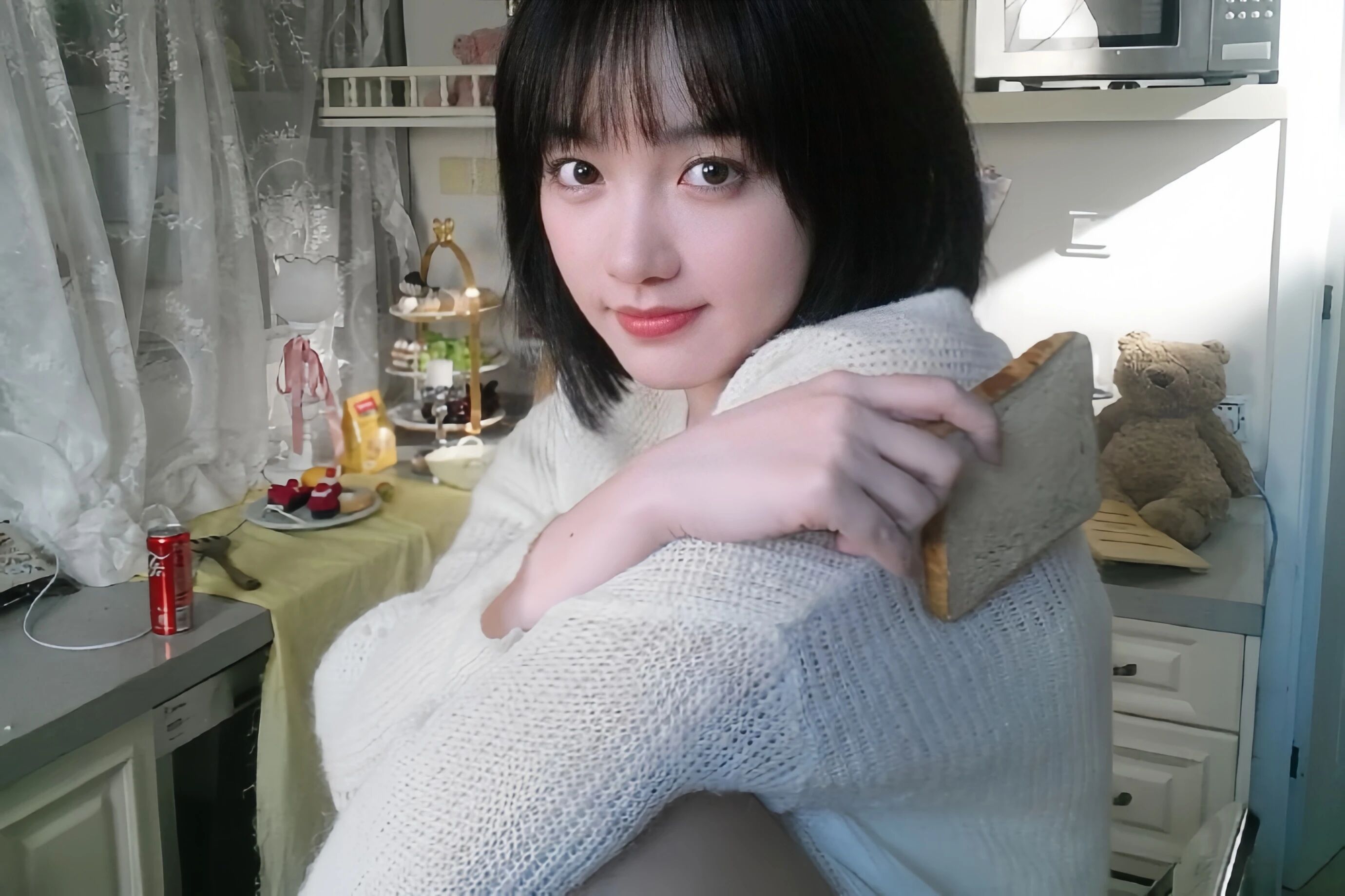 她留着齐肩的碎发,额前的绒毛蹭着眉骨,眼睛像浸了温水的黑葡萄,咬吐司的时候会不自觉眨一下眼。不是刻意卖萌,是没化妆素颜脸的松弛感,却比精心摆拍的硬照勾人十倍。我放大图片看她的睫毛,根根分明扫在眼下,真的突然想伸手替她把粘在嘴角的面包屑擦掉。