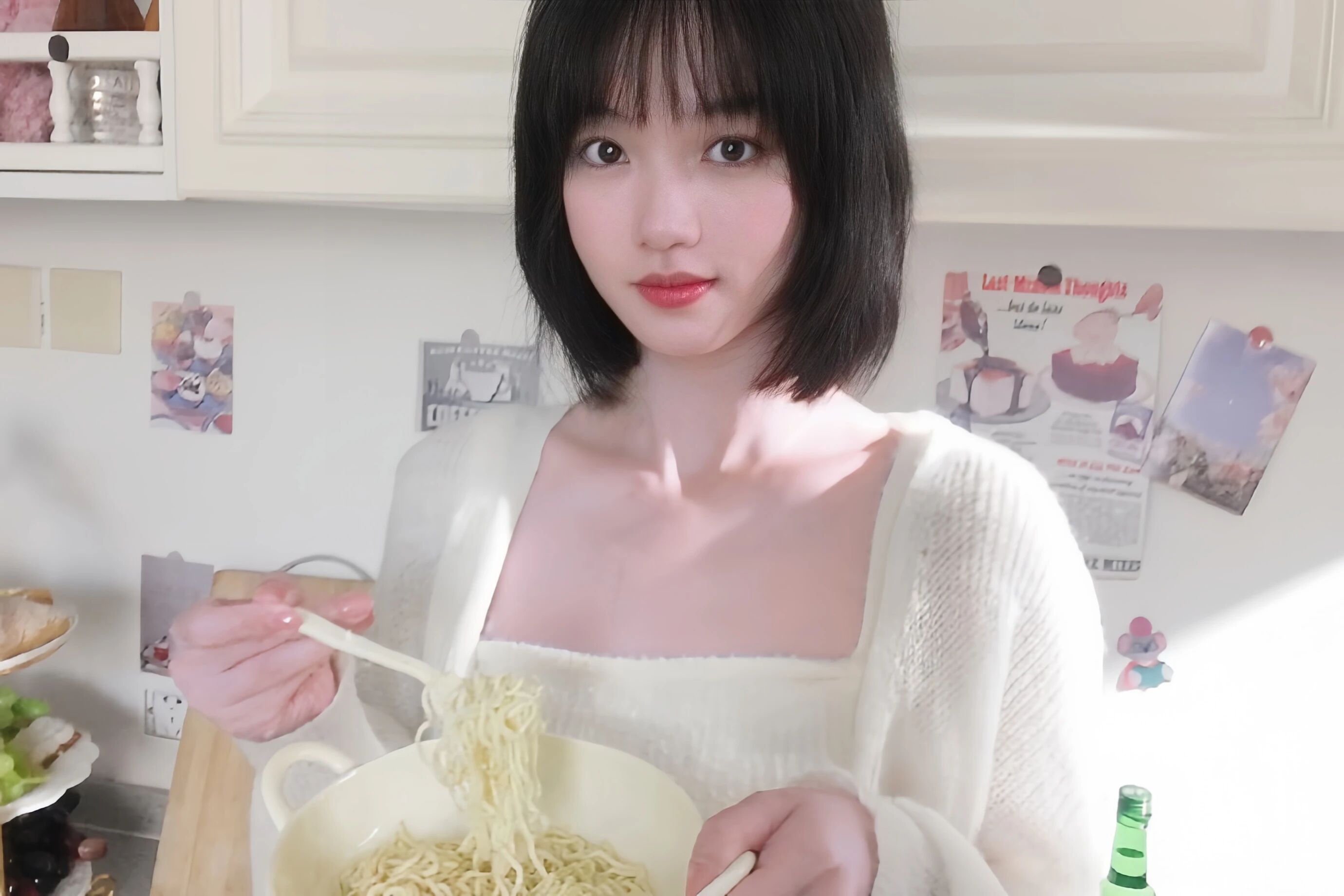 背景是乱乱的房间,蕾丝窗帘飘着奶白色的纱,小熊玩偶蹲在角落打盹,可乐罐矗立在台面上。她抱着泡面碗的样子像偷穿姐姐衣服的小孩,宽松的针织衫领口垮到肩膀,露着一点米白色吊带的边。叉子挑起面条的时候,锁骨在阳光下泛着粉,我盯着那截细白的脖子看了三分钟,却忘了自己的外卖已经凉透。