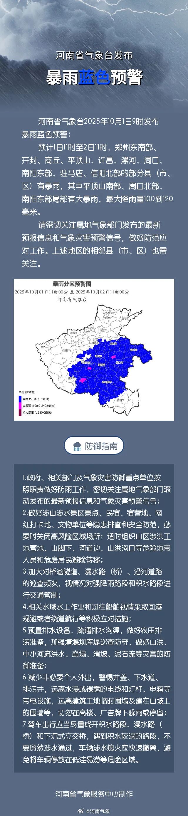 预计今天下午到2日是较强降水时段,全省有小到中雨,沿黄及以南有大雨,东部、南部暴雨,局部大暴雨!河南省气象台今天上午9时已经发布暴雨蓝色预警,提醒大家尽量避开强降雨时段驾车出行,如需外出,需谨慎慢行!
