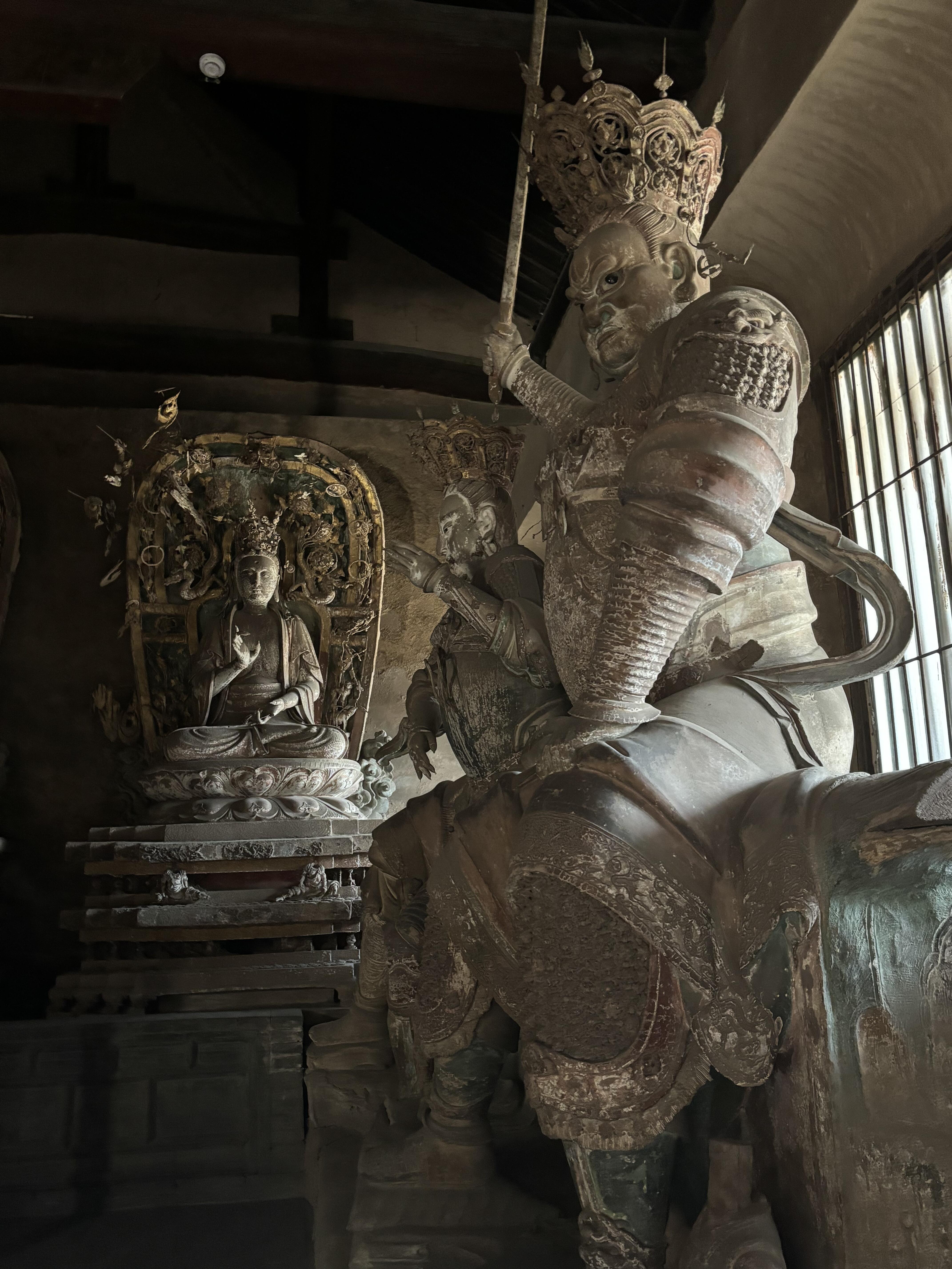 双林寺的彩塑,最绝的是“活”——不是简单的“像”,是透着股“精气神”。就说那尊被誉为“天下第一韦陀像”的造像,藏在罗汉殿里,高不过两米,可你站在他面前,会忍不住屏住呼吸。韦陀身披铠甲,左手叉腰,右手握着金刚杵,身体微微前倾,眼神锐利得像能穿透人的心。最妙的是他的铠甲,每一片甲片都顺着身体的线条走,褶皱处还留着“风吹过”的弧度,连铠甲上的铆钉都刻得清清楚楚,仿佛下一秒他就要迈开步子,护着整个寺庙。有人说这尊韦陀“把武将的刚和菩萨的仁捏在了一起”,因为他眼神里有威严,却没有凶气;可也有人觉得“太凶了,不像菩萨”——你绕到韦陀像后面,发现他的铠甲背面还刻着缠枝莲纹,连腰带的流苏都雕得能看出“轻盈感”,突然懂了:工匠不是在“雕一个武将”,是在雕一个“有血有肉的守护者”,刚硬的铠甲下,藏着的是柔软的慈悲。